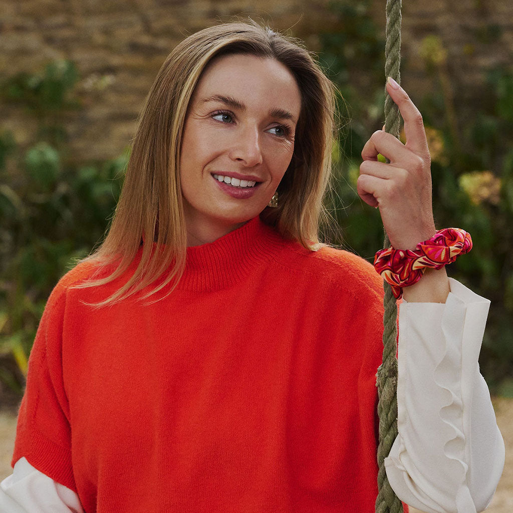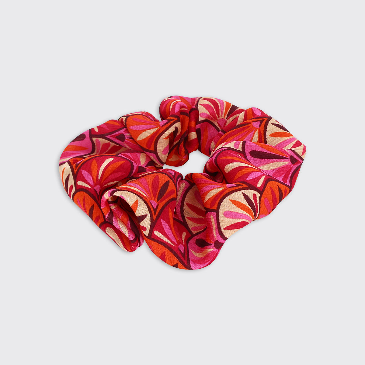 Add a pop of colour and retro style to your hairstyle with our Agnes Scrunchie. This soft scrunchie features a vibrant, retro inspired print in a mix of red, pink, and orange hues. Designed to be gentle on your hair, it provides a secure hold while adding a fun, eye-catching detail to your ponytail or bun.