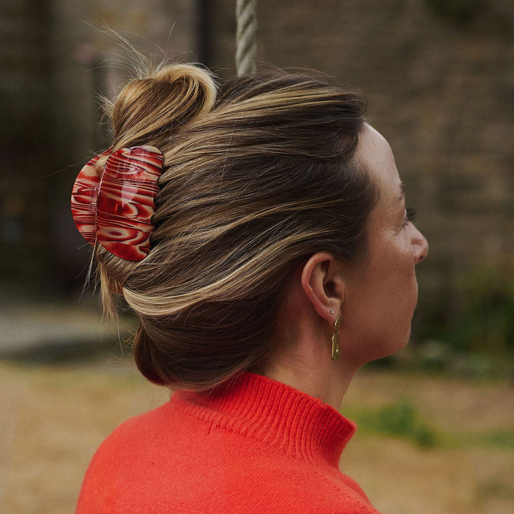 Designed with a bold twist, this chunky claw clip comes in a striking red and cream swirl. Keep it your bag for effortless styling and a statement piece made for everyday wear.