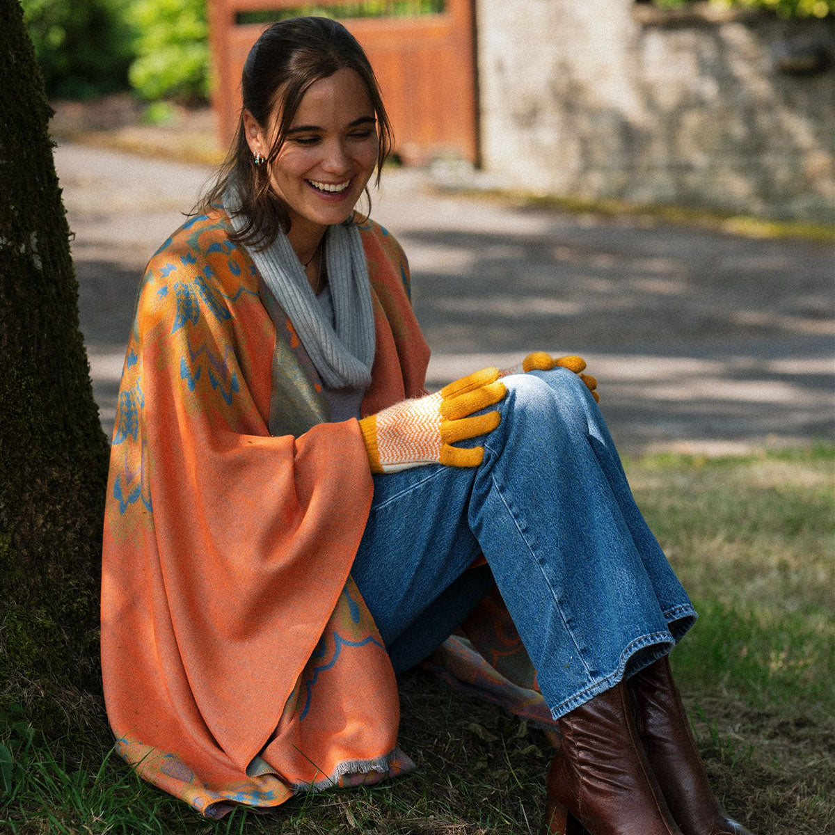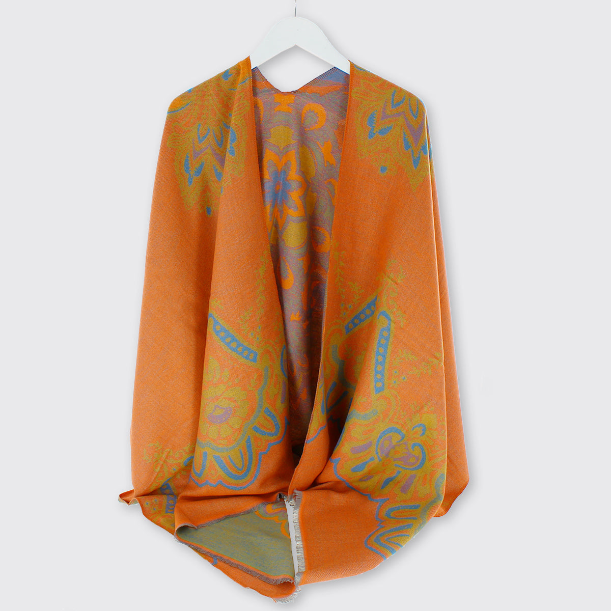 A generously sized over the shoulder wrap in an orange, teal and plum bohemian pattern. Soft on the neck and great for adding a little warmth. An easy way to update your look.