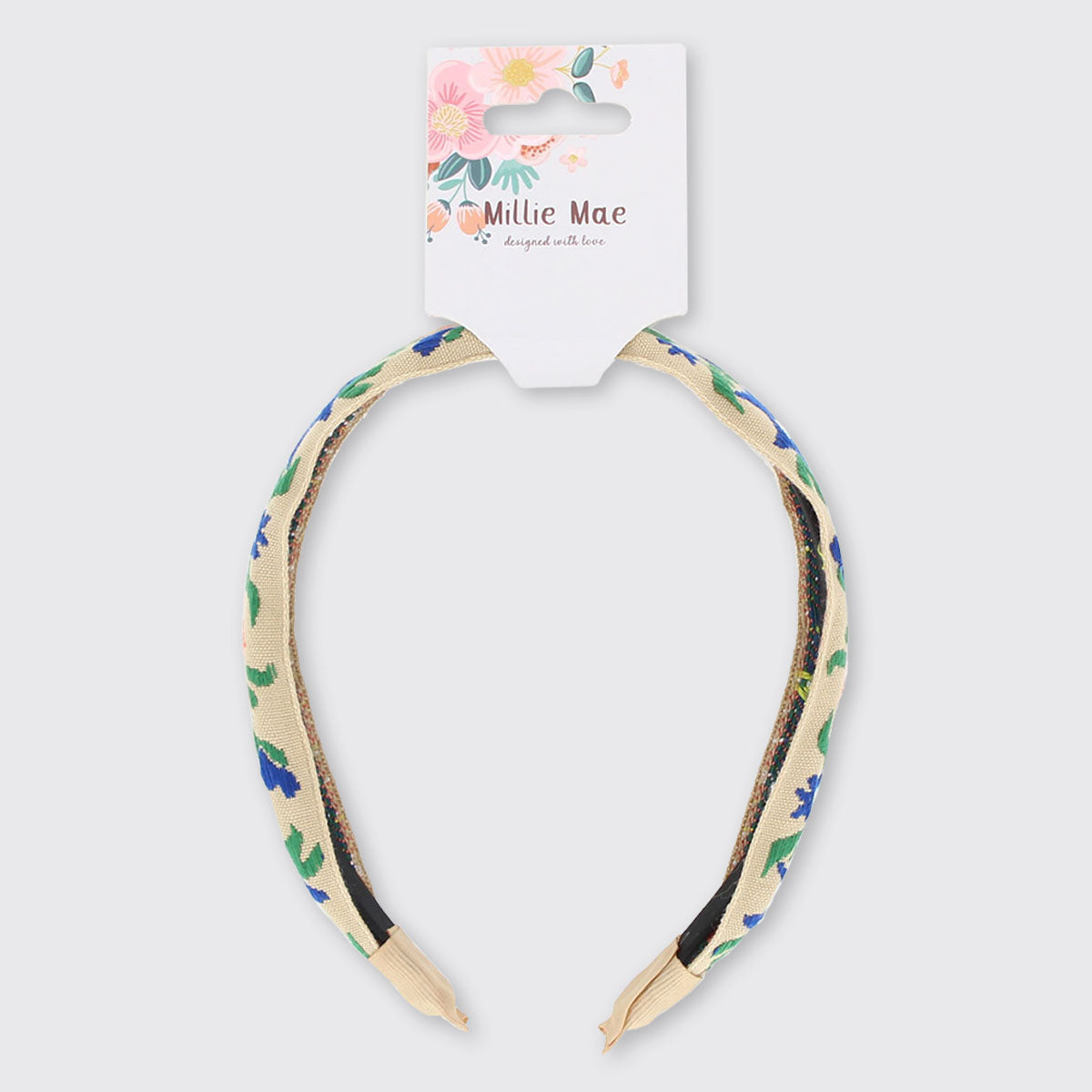 A beautiful blossom wide headband in taupe with pink, blue and green, finished with a twist knot top. Perfect for a stand out look. Our Millie Mae headbands are handmade, hold hair securely and are very comfortable to wear.