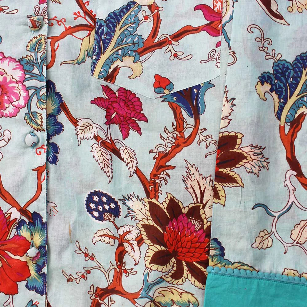 This vibrant print of stylised exotic flowers in reds and blues on a pale blue background is a stylish choice. The colours of the print are complemented by the contrasting turquoise trim with pom-pom edging on the jacket cuffs and hems of the trousers. The pyjama jacket fastens with fabric-covered buttons and has a single breast pocket, and the trousers have an elasticated drawstring waist for comfort.