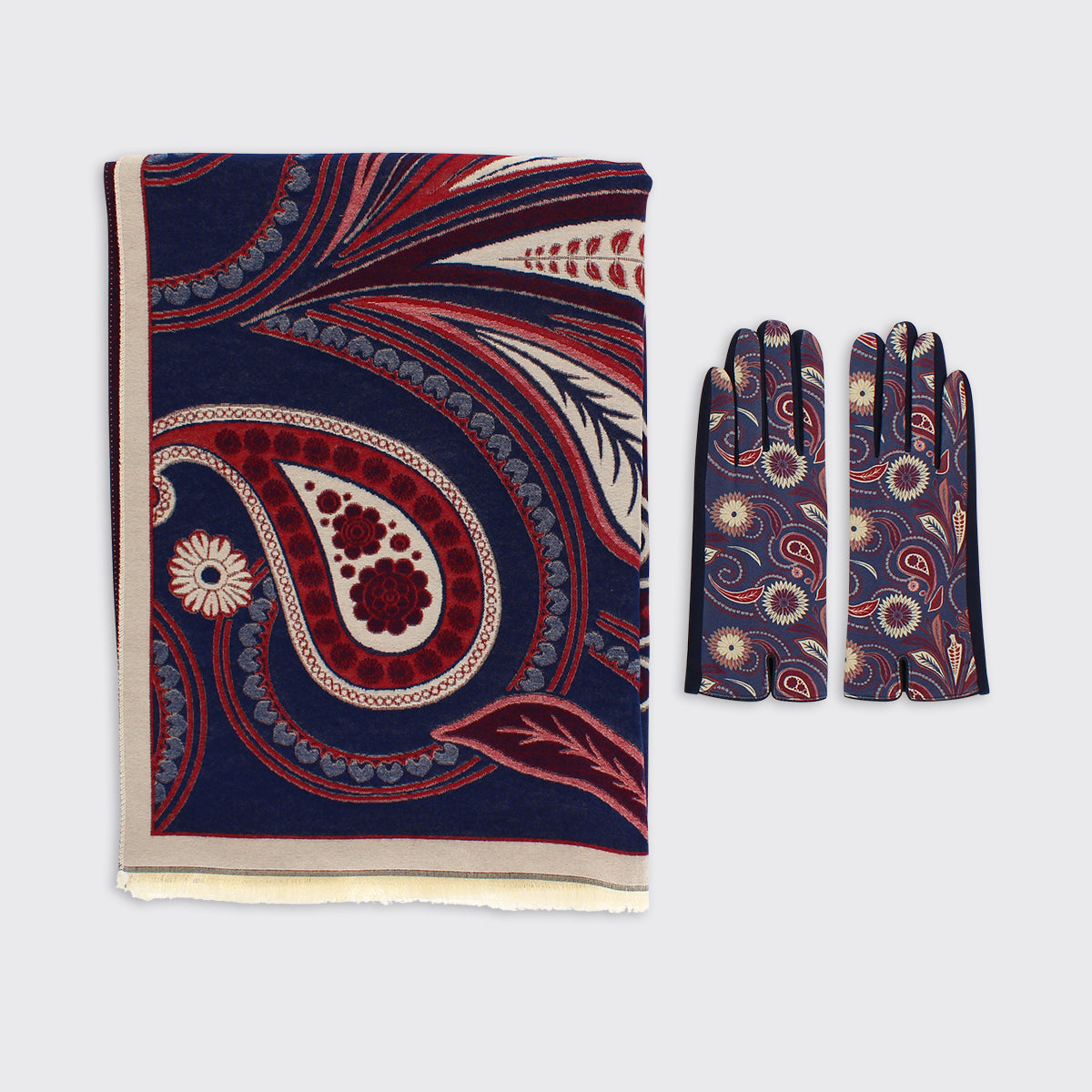 The most elegant glove in deep navy with a delightful burgundy and cream paisley inspired pattern. Pair with our matching Chloe Woven scarf for a smart winter look.