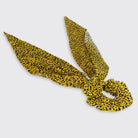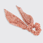 Hair scrunchie with long ponytails in crinkled fabric. Snag free and kind to hair. A simple way to get the scarf-tied look.