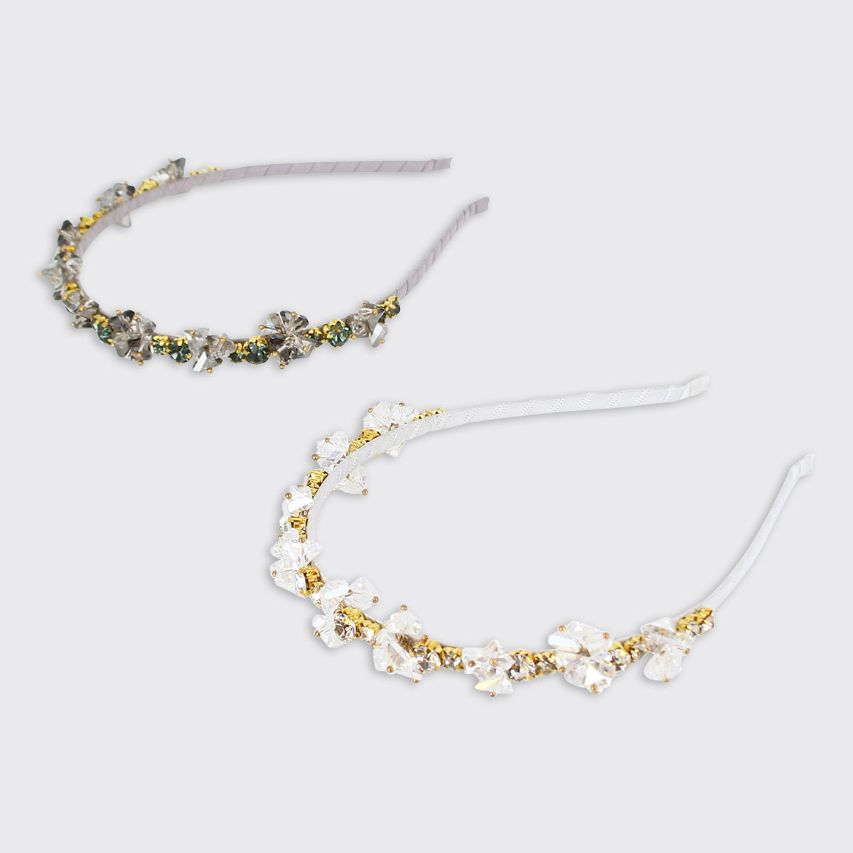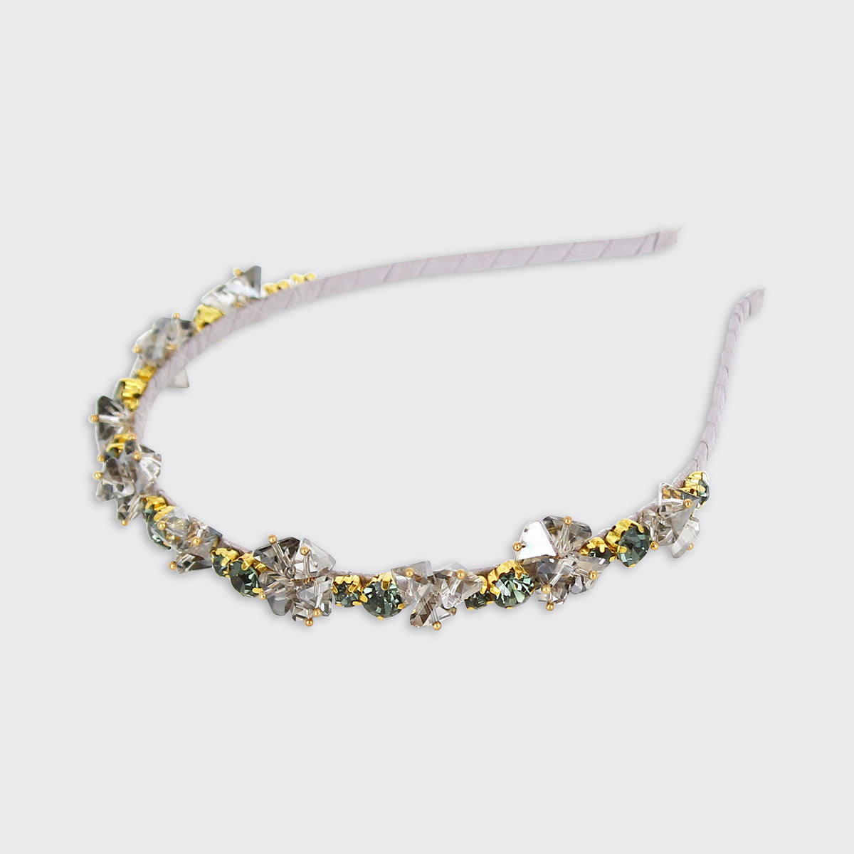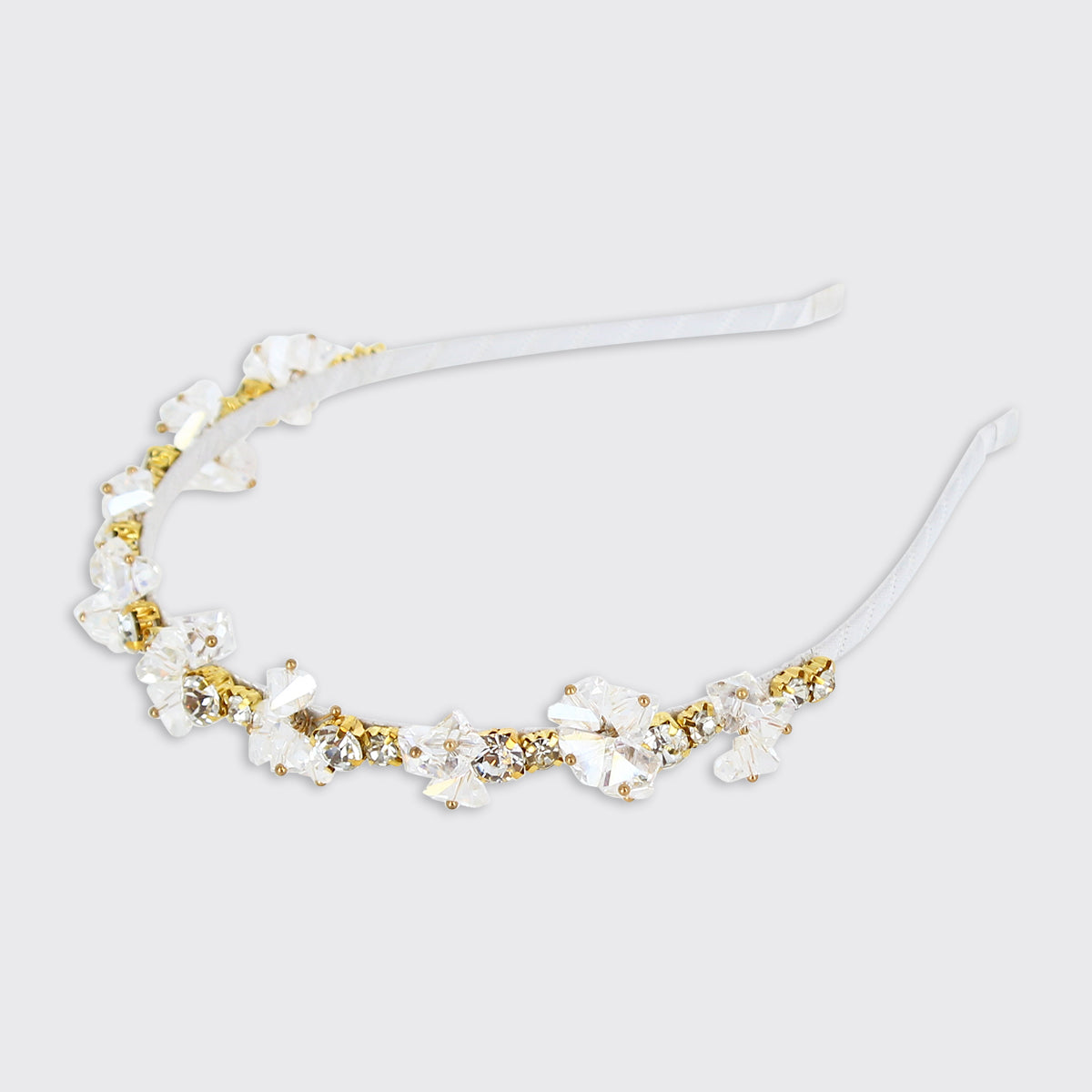 A stunning crystal headband encrusted with jewels of different sizes set in gold clasps. The slim band gives this headband a tiara-like look.