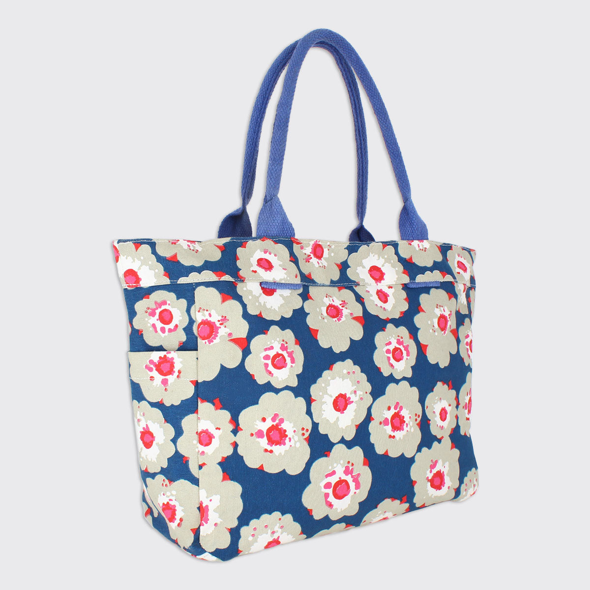 We love our new Daisy Blue print so much we had to have it in a handbag. This roomy tote bag has a zip closure, an interior pocket for small items and exterior pockets on each end ideal for slim water bottles. The bag can sit on the shoulder or be hand held. The strong cotton fabric and woven handles ensure the bag will cope with the heaviest of loads.