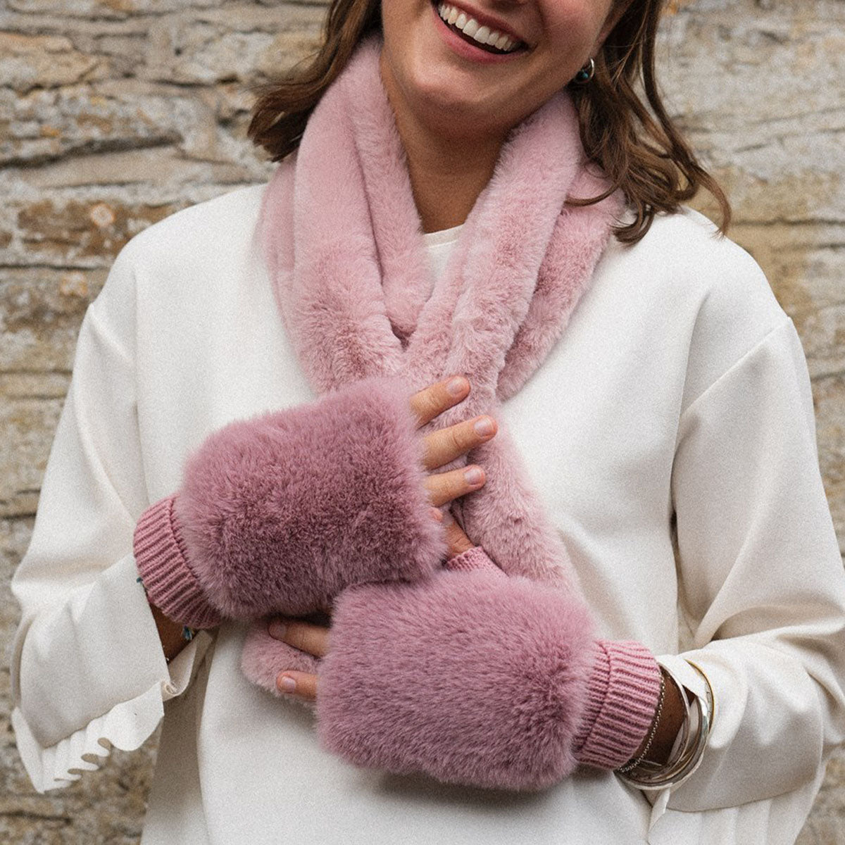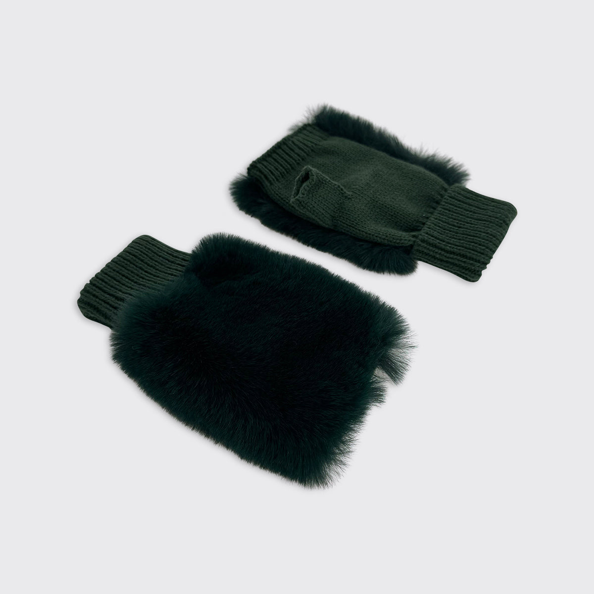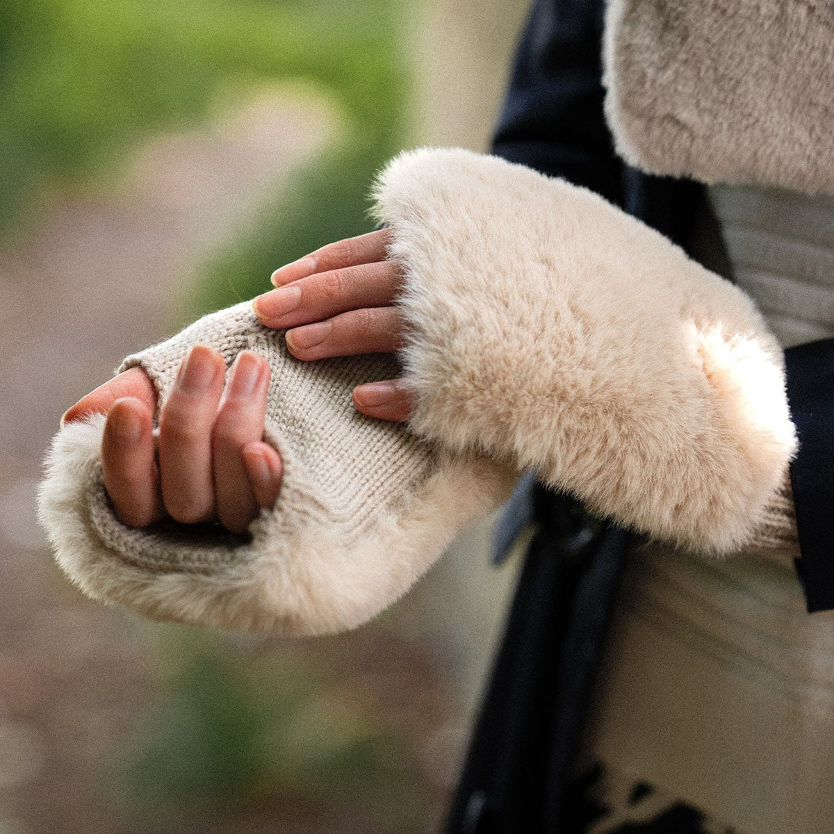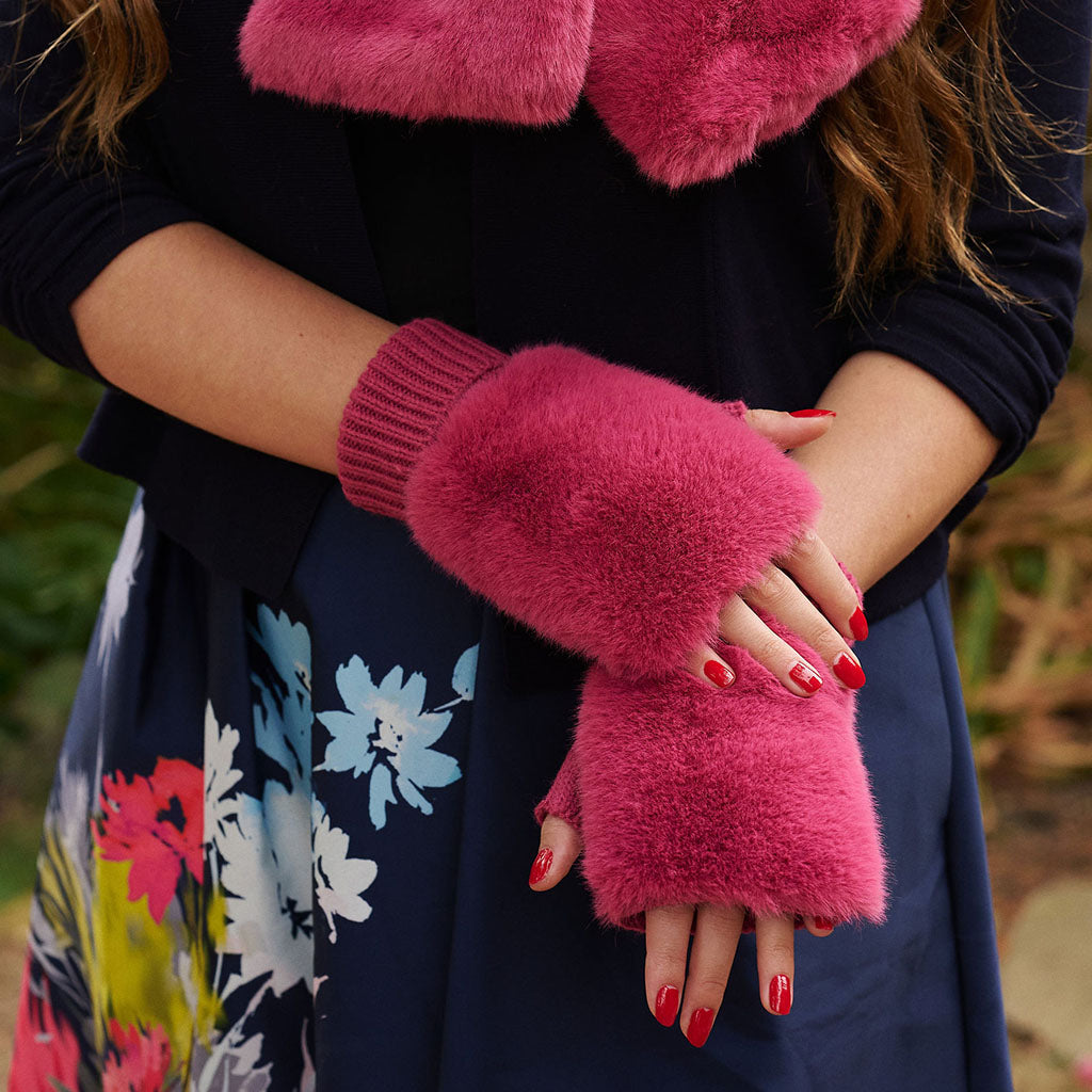 The ultimate glamorous fingerless glove. Wool feel palm topped with sumptuous faux fur.