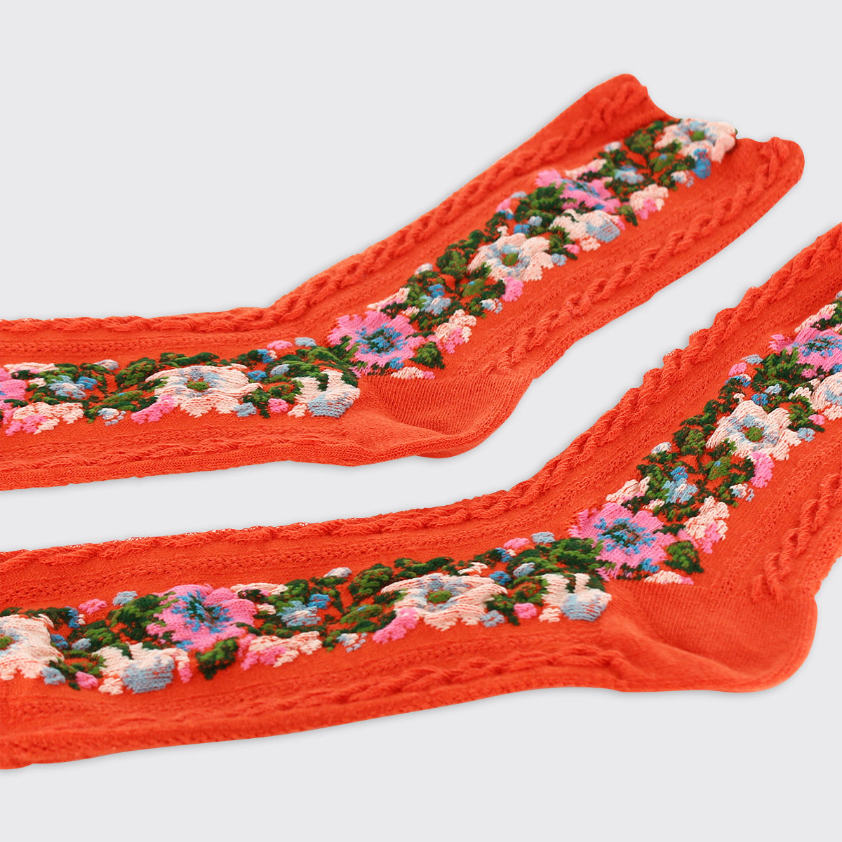 These socks feature an elegant floral garland design running down the sides.