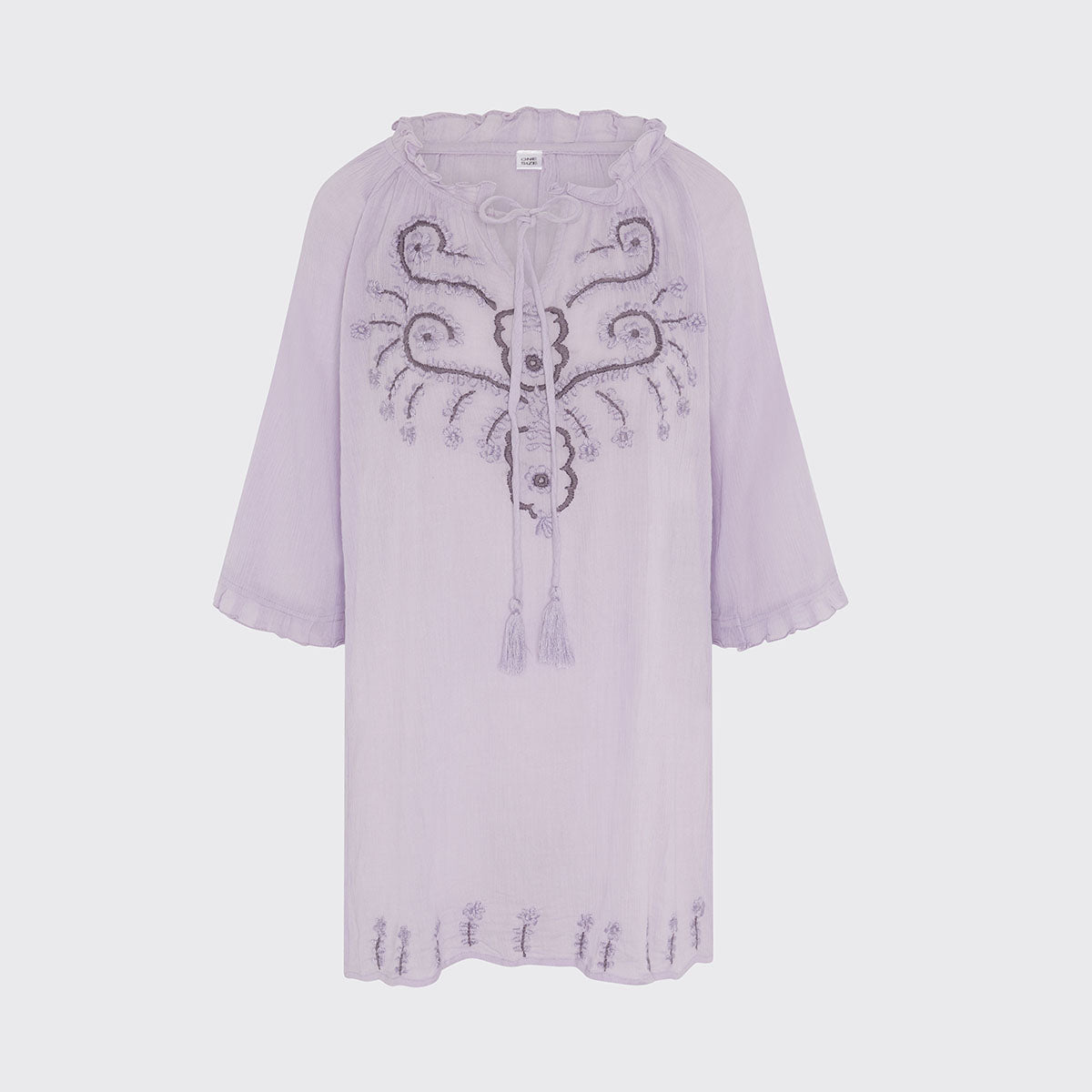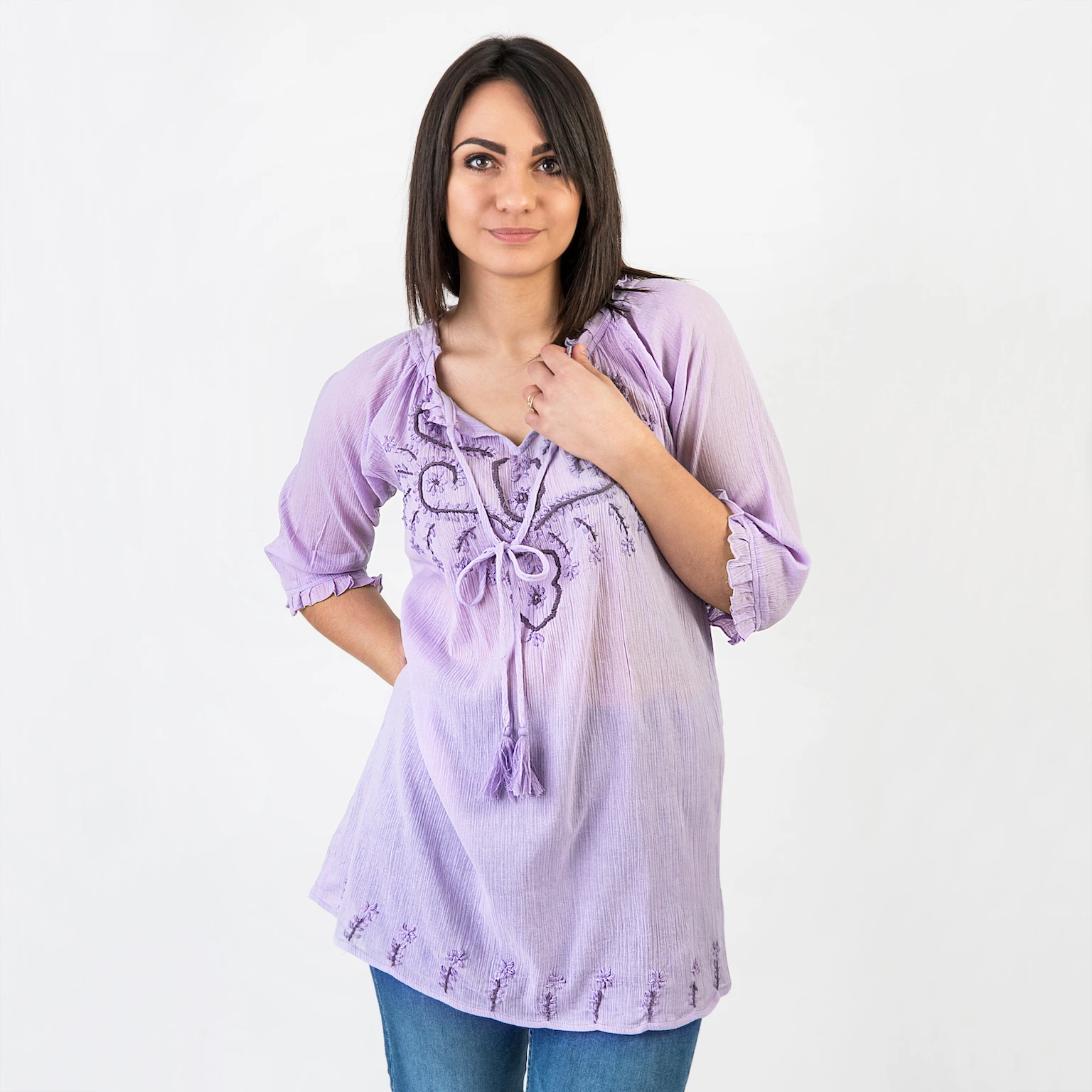 The perfect summer top with beautiful embroidery! A loose fit with below the elbow length wide sleeves and a smock style v-neck with long tie tassels and waist detailing.