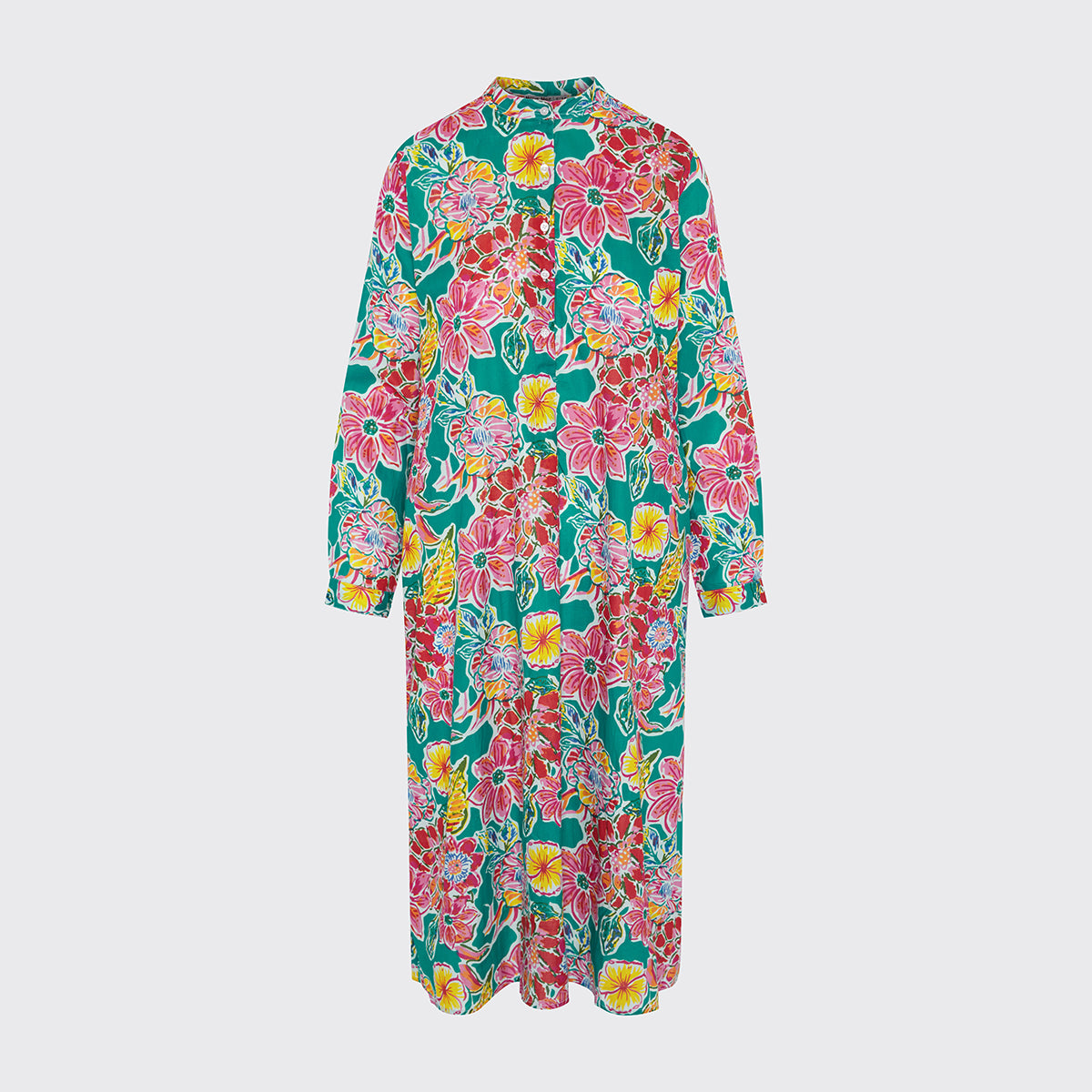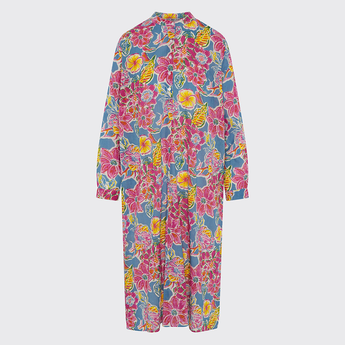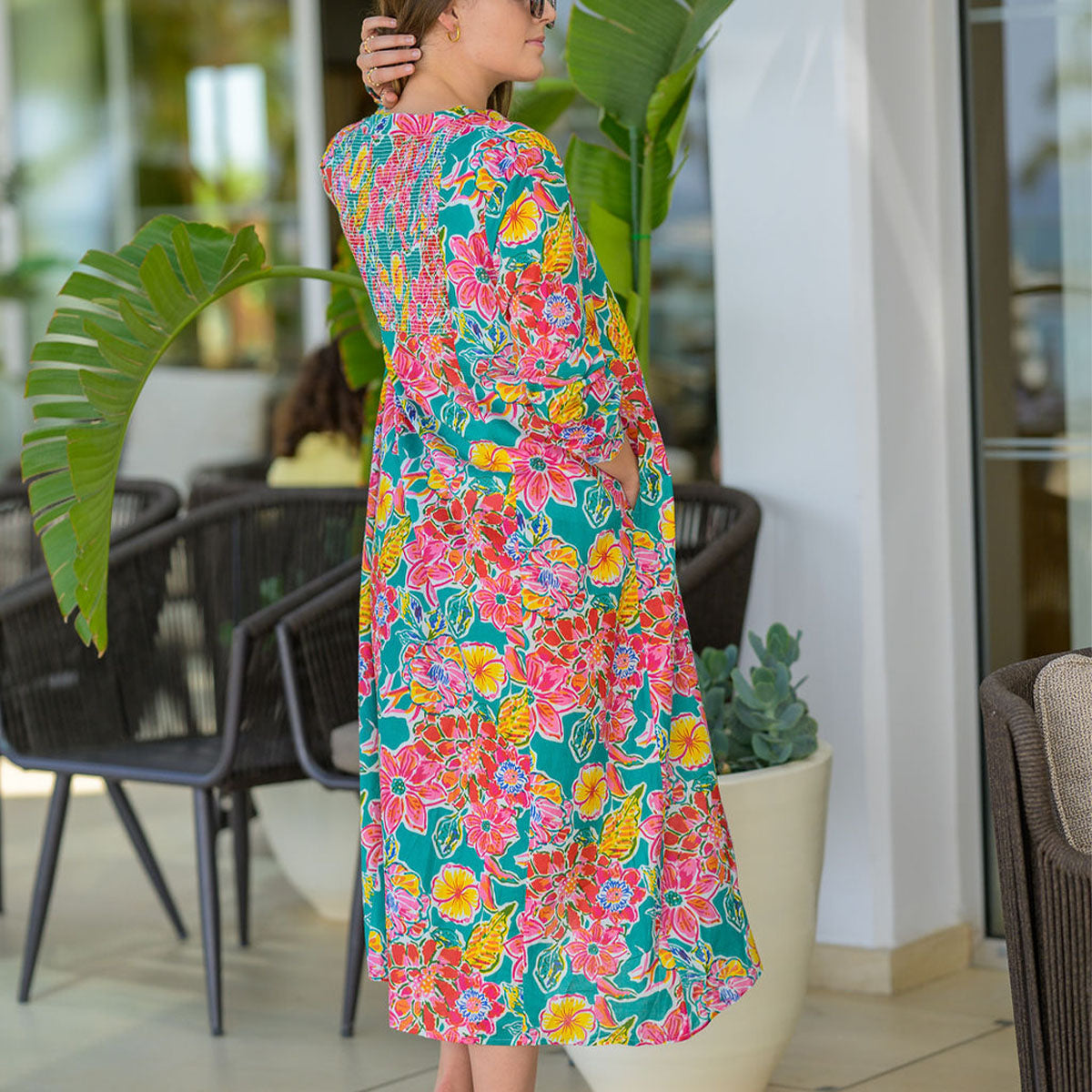 An array of colourful blooms makes this a vibrant addition to your wardrobe. The smocked back panel makes this an eye catching dress and pockets make it a practical one too. Made from breathable cotton. Rolls up to a small size - great for suitcase space!