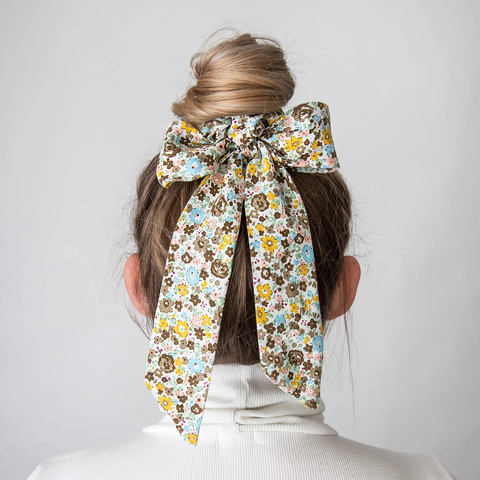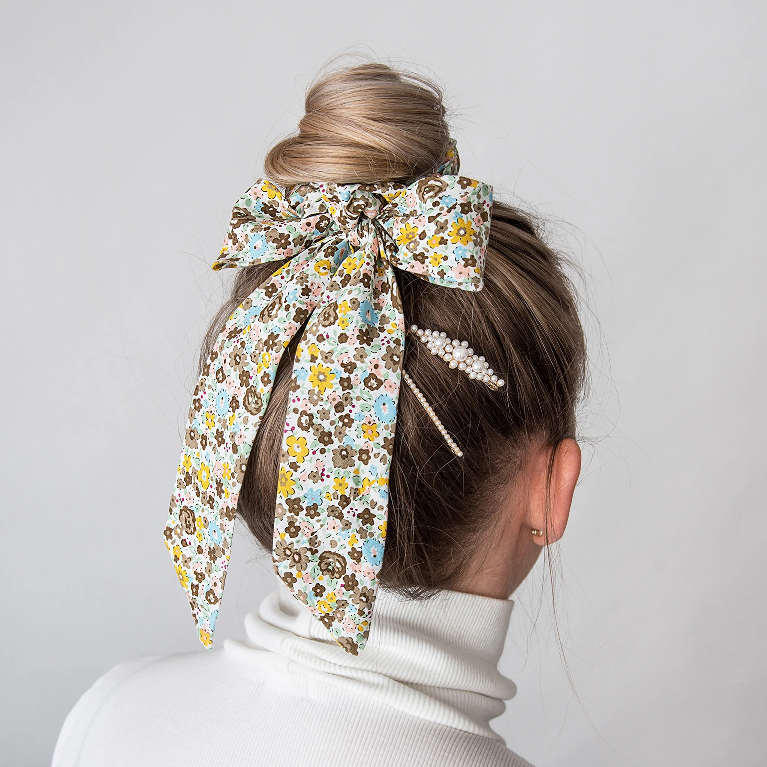 | Hair scrunchie with a cute bow and long ponytails in a pretty floral fabric. |