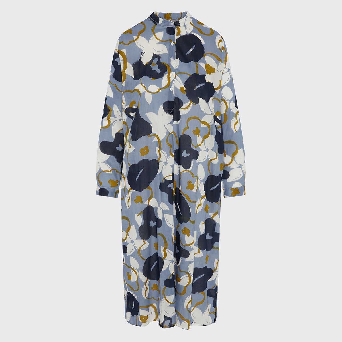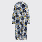 A striking long dress for bold pattern lovers. Navy blue, mustard and white blooms sit on a mid blue background. The smocked back panel makes this an eye catching dress and pockets make it a practical one too.