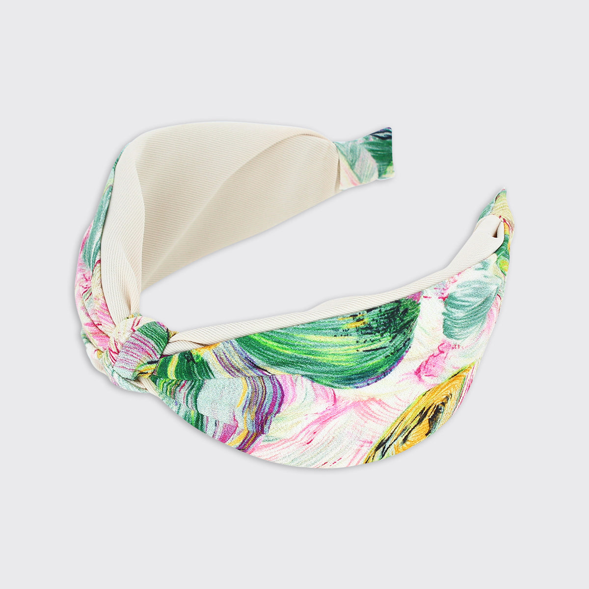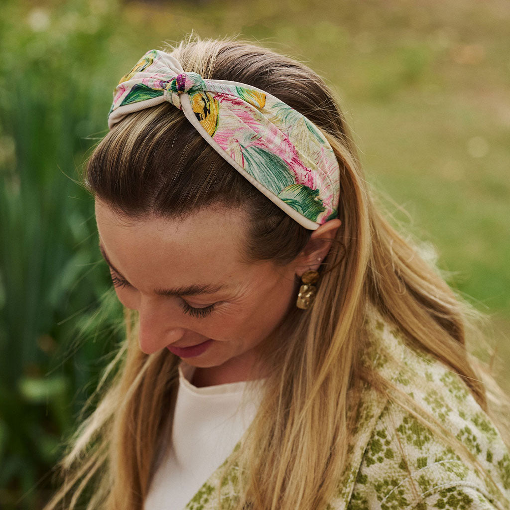 Add a burst of colour to your hair with our Ivy Wide Headband. Its soft, abstract print is a fun mix of green, yellow, and pink. The wide design makes it comfortable and easy to wear, just slip it on to push your hair back for an effortless look.