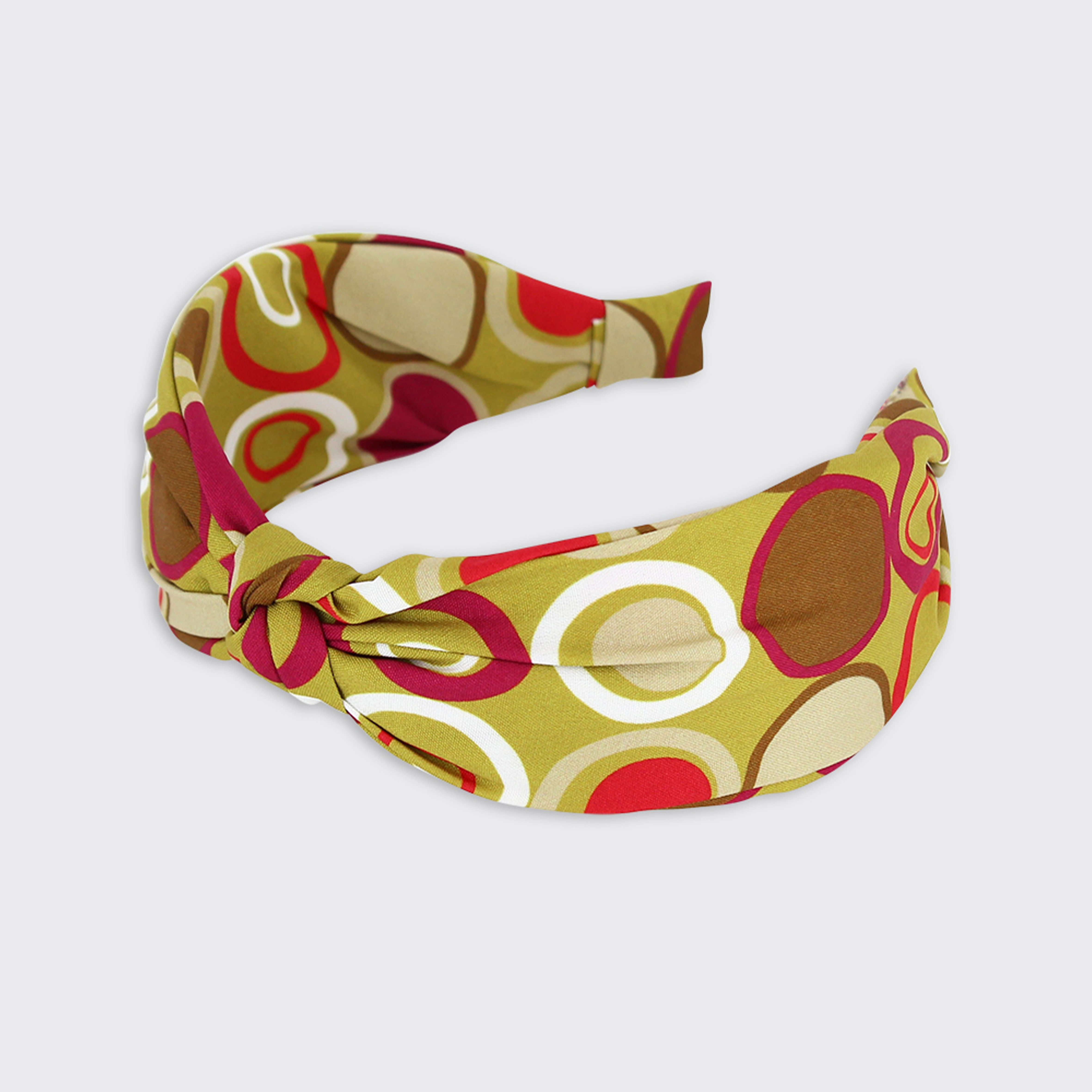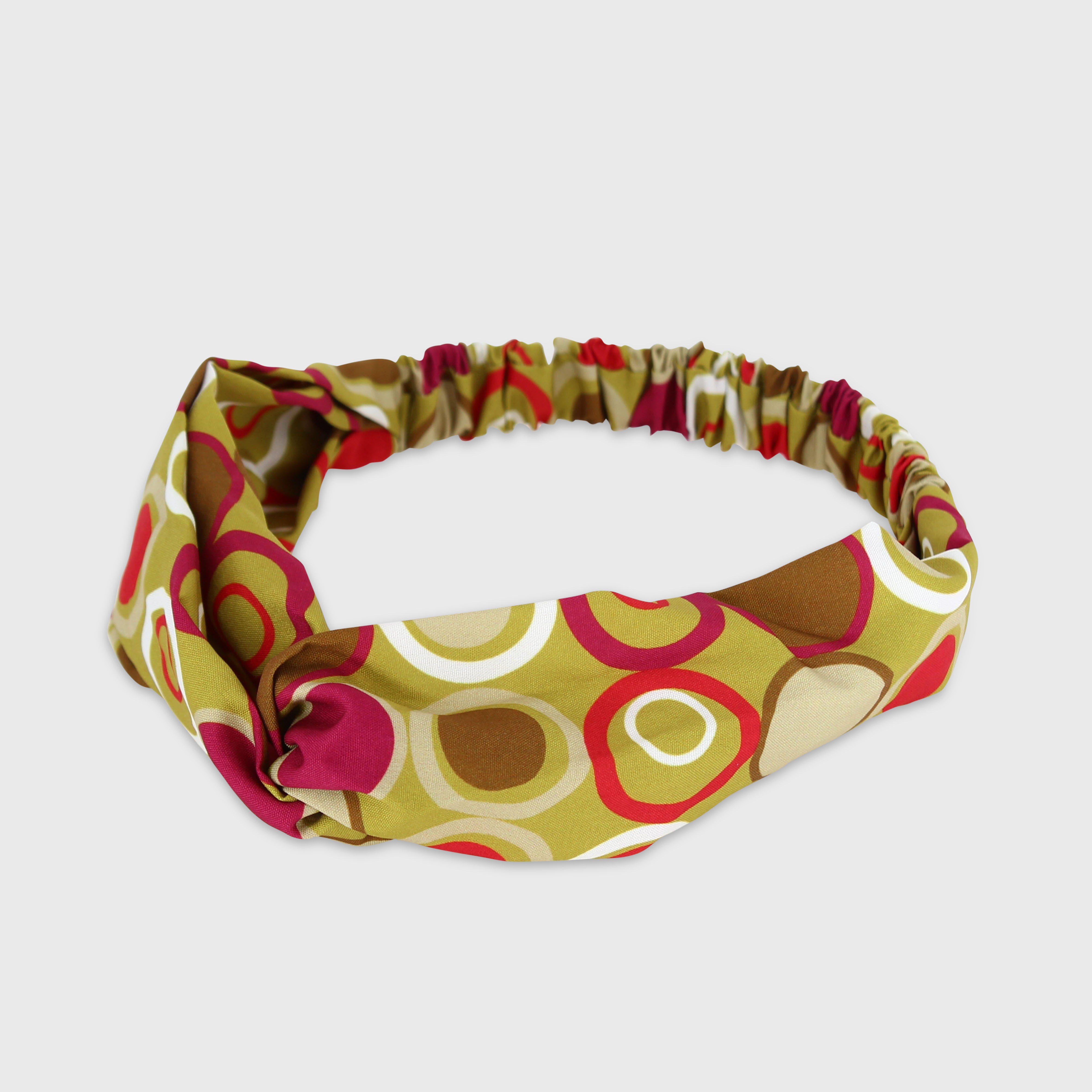 Channel retro vibes with this geometric headband, featuring a mix of olive green, rich burgundy, and cream in circular patterns.