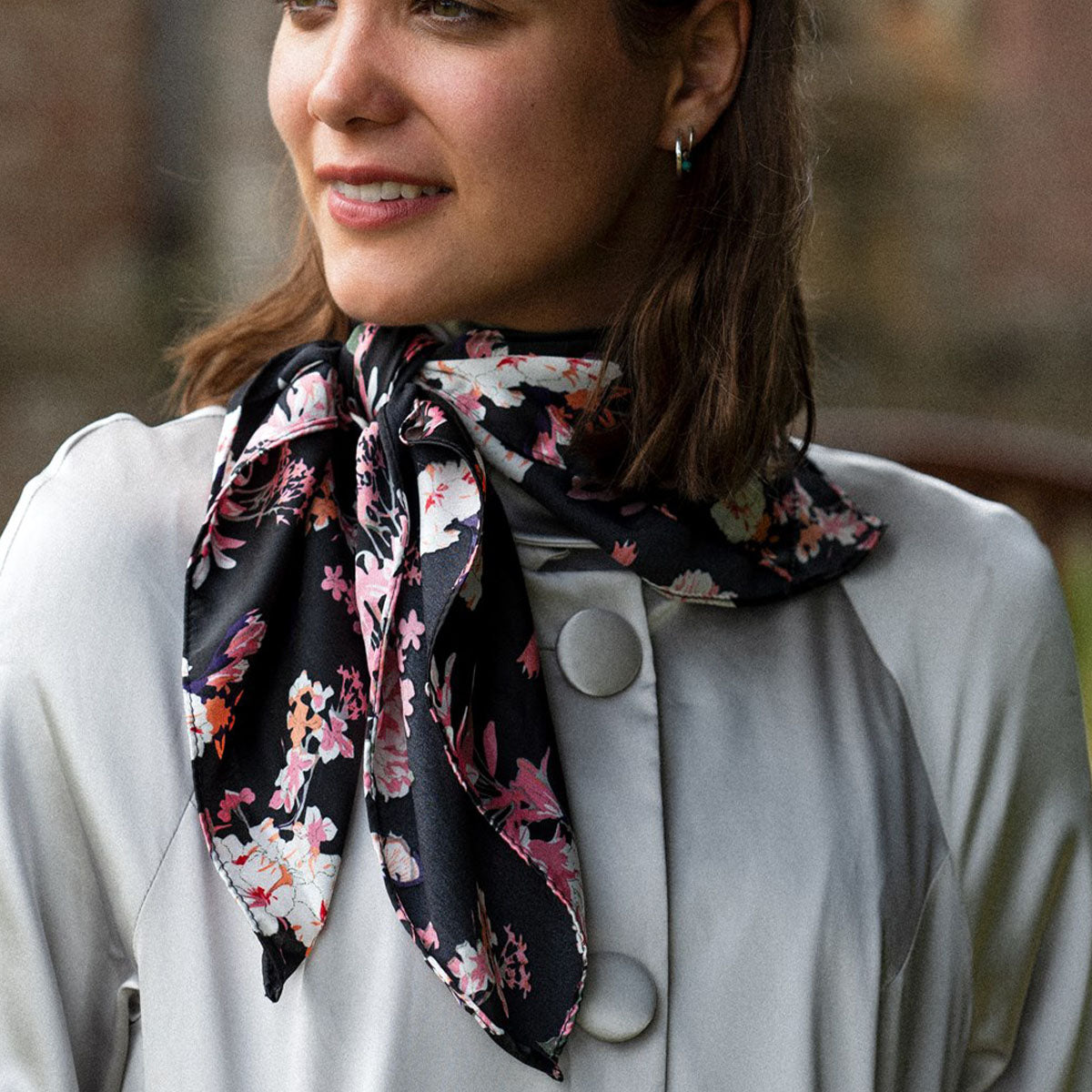 A beautiful oriental inspired silk-feel scarf that can be worn around the neck or in the hair. Ideal as a neck scarf, head scarf or hair wrap.