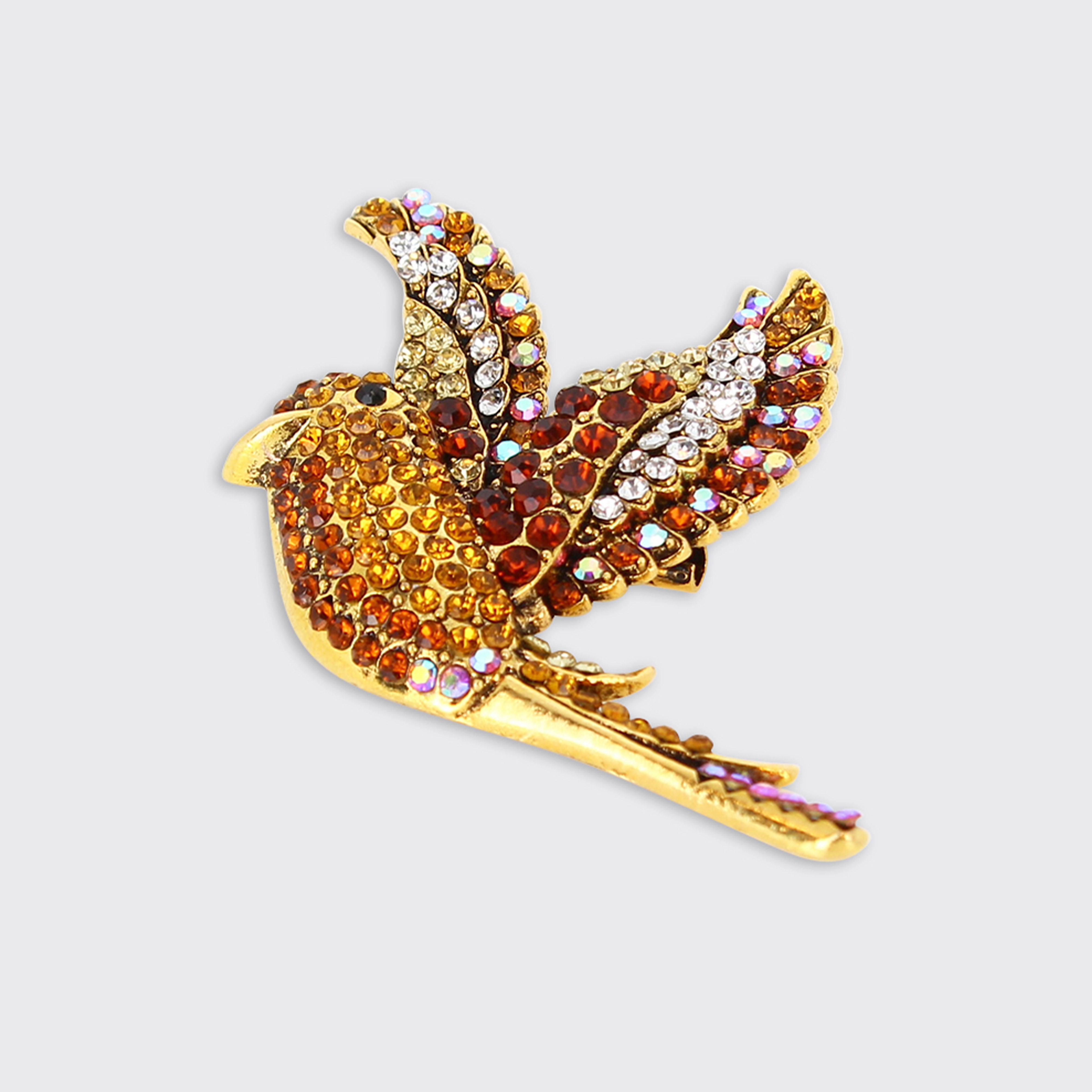 Elevate any outfit with our vibrant Kingfisher brooch. This stunning accessory features a kingfisher design embellished with colourful gemstones in shades of orange. Style your wrap or scarf by holding it together in a unique way.