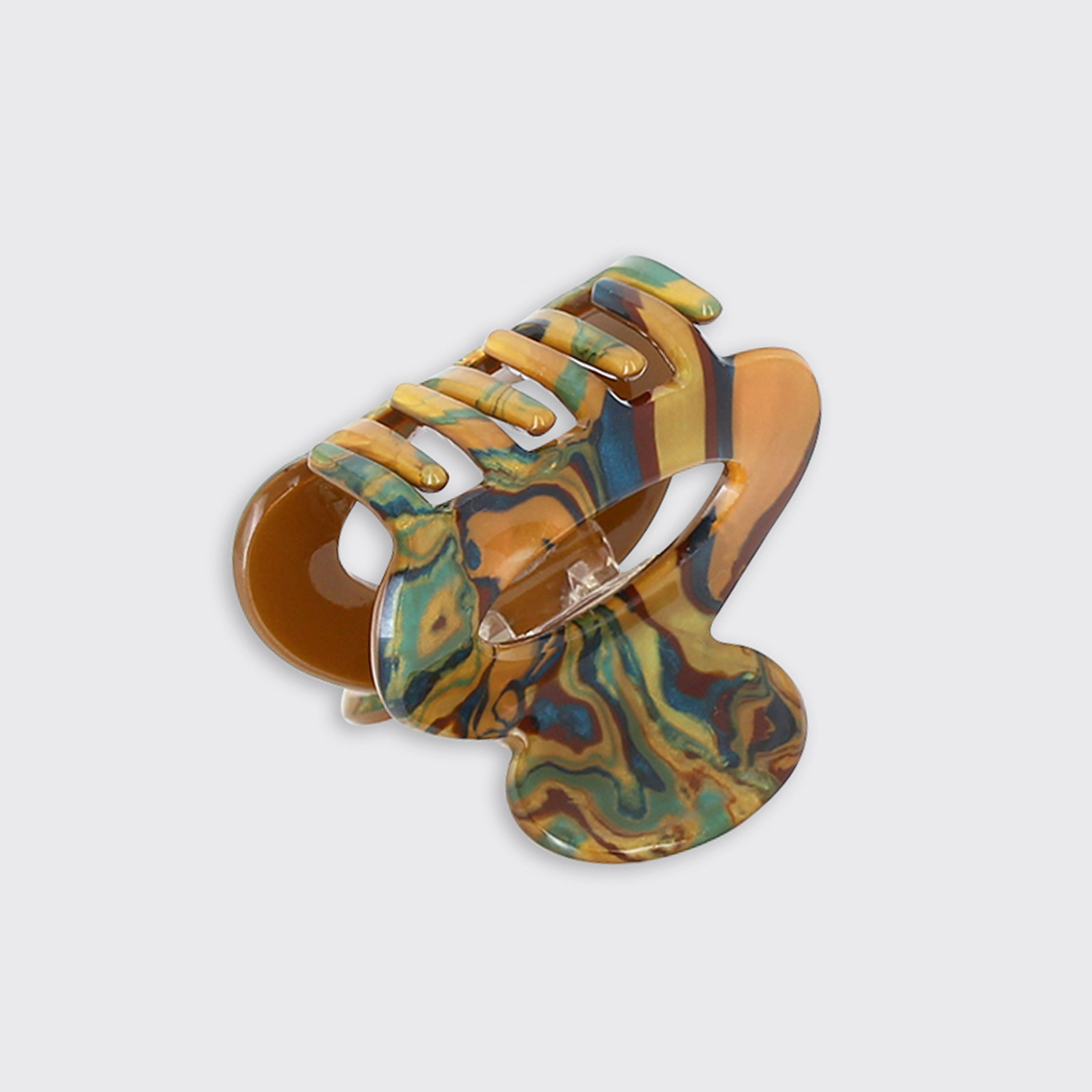 This small claw clip is perfect for an effortless look and on-the-go styling! It features swirls of green, teal, and gold.