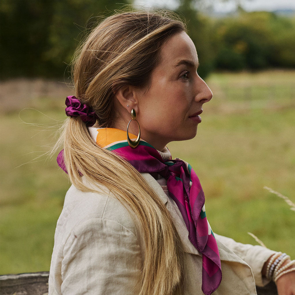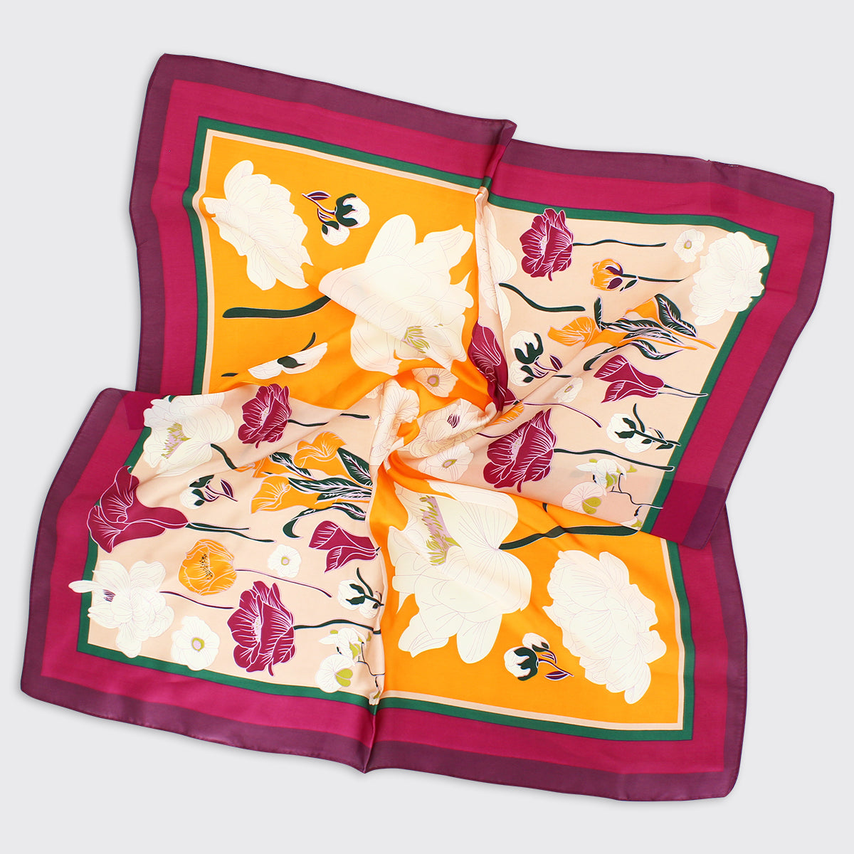 This elegant floral square scarf is the perfect versatile accessory. With their infinite ways to tie, these scarves can be worn as a traditional neck scarf, a chic ribbon in your hair, or even as a vibrant pop of colour on your bag.
