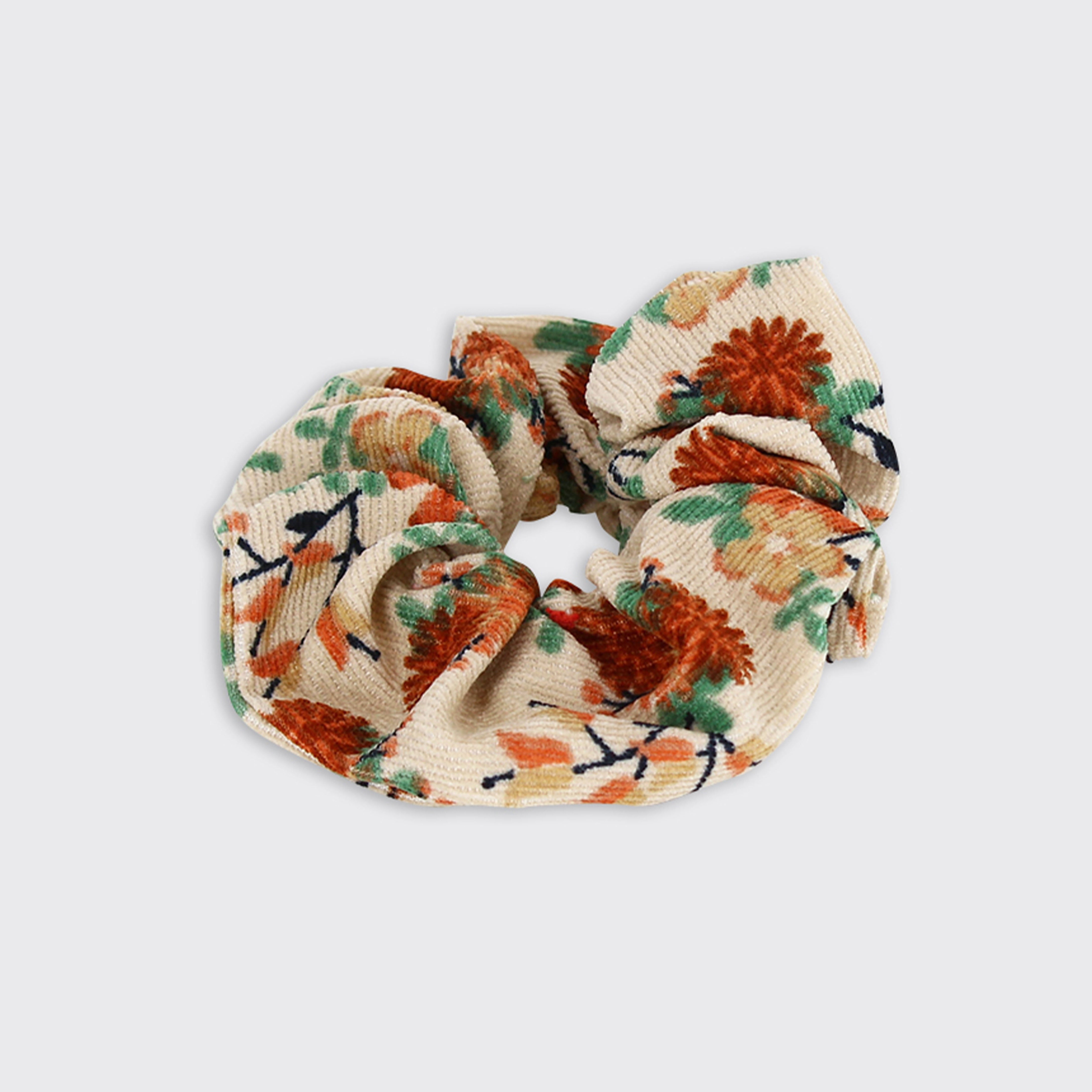 Make everyday a good hair day with this vintage-inspired floral scrunchie. Its earthy tones of rust, green, and cream add a touch of autumnal charm to any look.