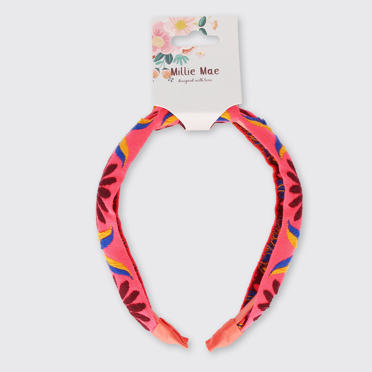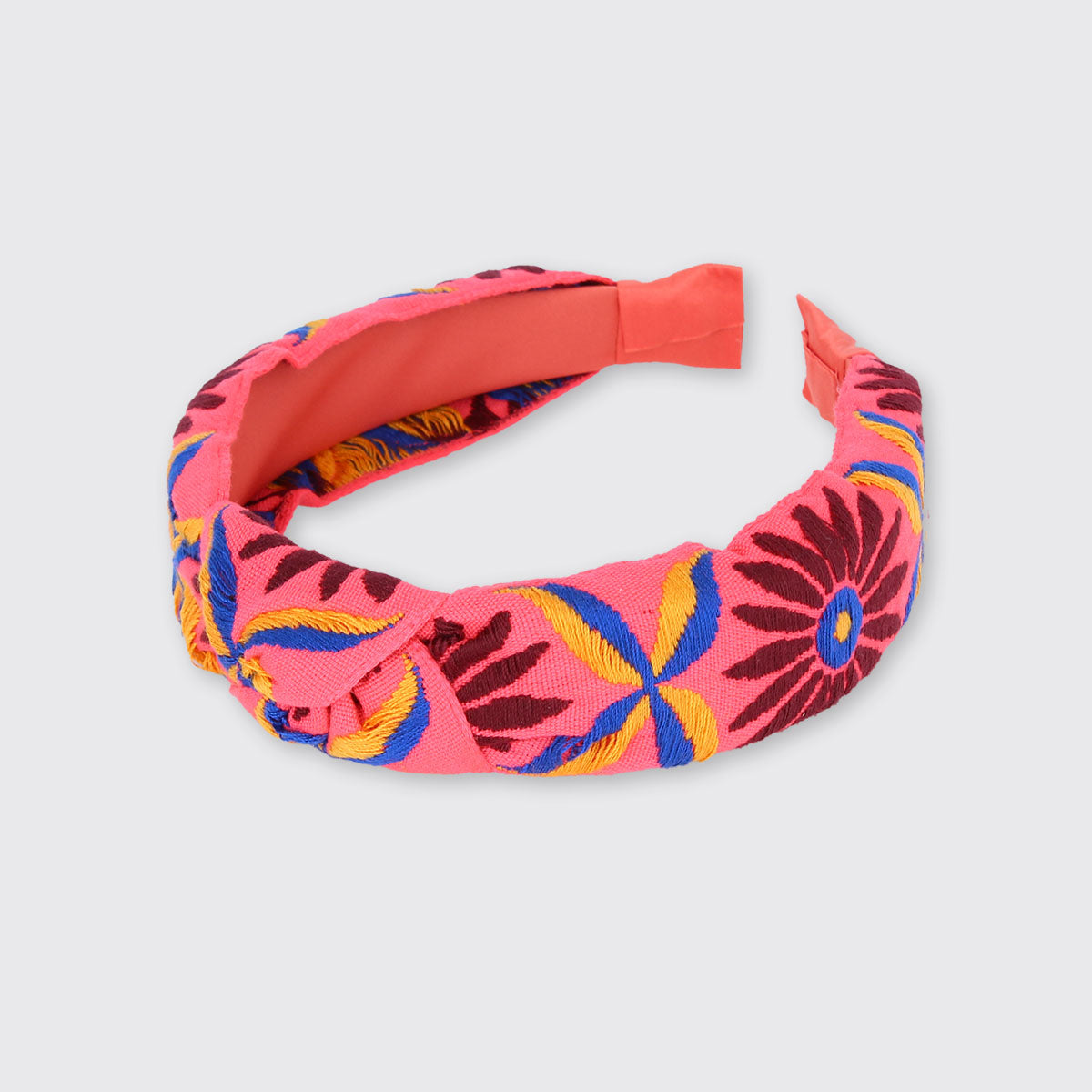 A beautiful lotus flower wide headband in coral pink with blue and yellow, finished with a twist knot top. Perfect for a stand out summer look. Our Millie Mae headbands are handmade, hold hair securely and are very comfortable to wear.