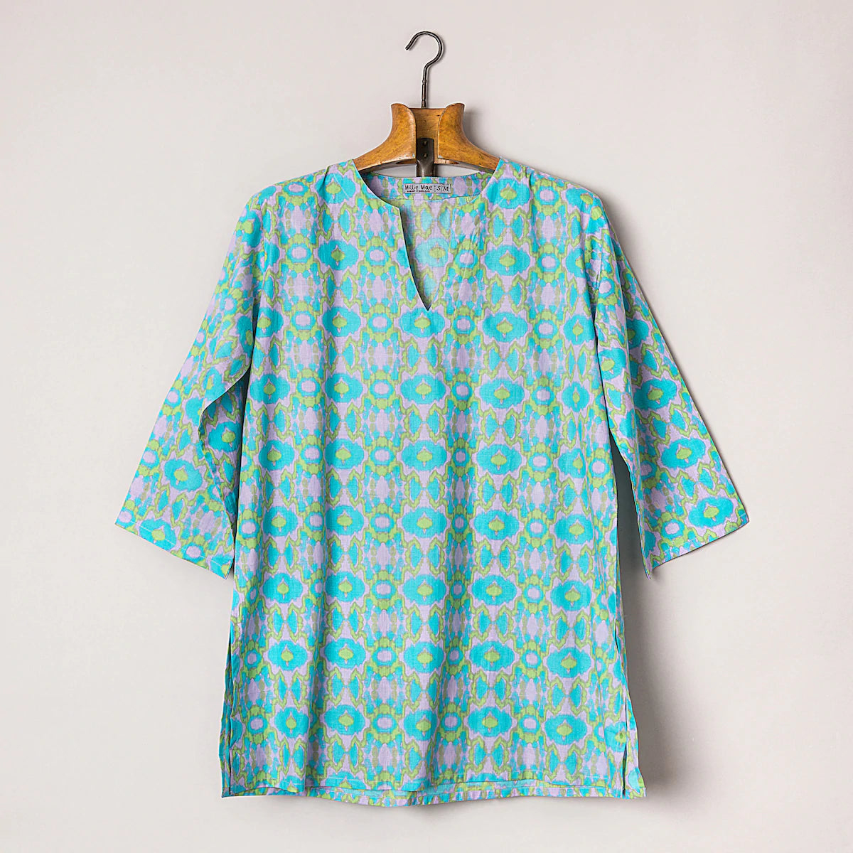 The perfect summer top! A loose fit with elbow length wide sleeves and a smock style v-neck. Made from breathable cotton and designed with a simple floral pattern. Rolls up to a small size - great for suitcase space!