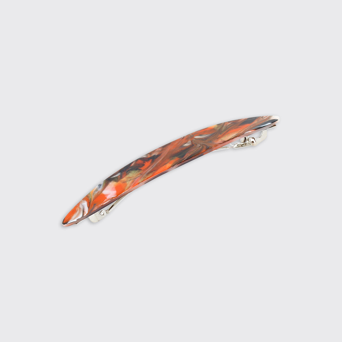 This long hair clip features a sleek, curved design which is perfect for adding a touch of timeless and sophisticated style to any look. The blend of orange, black, white and hints of gold create a unique, eye-catching hair accessory.