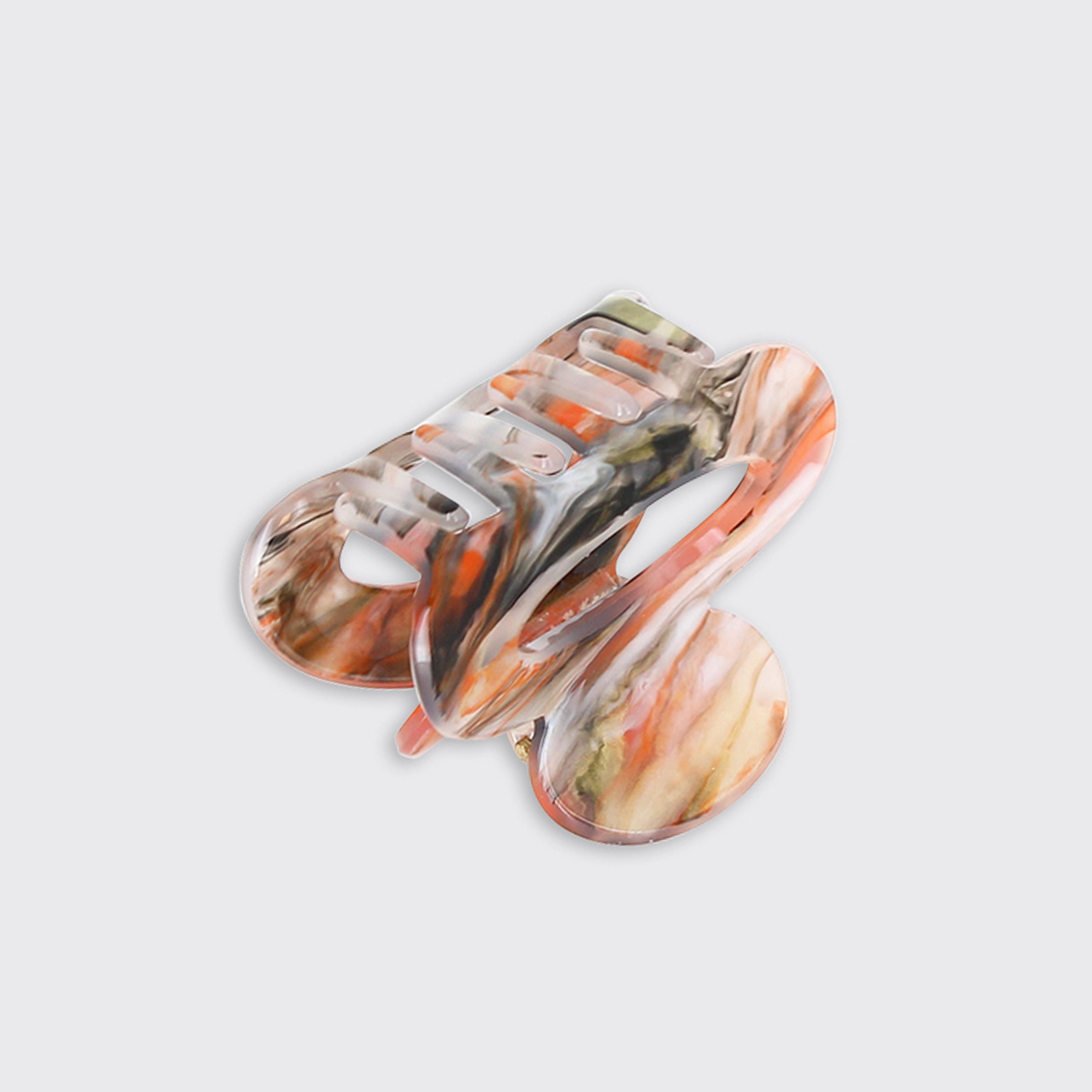 Perfect for keeping your hair in place, this small claw clip features a rust base with striking patterns of orange, white, and black swirls.