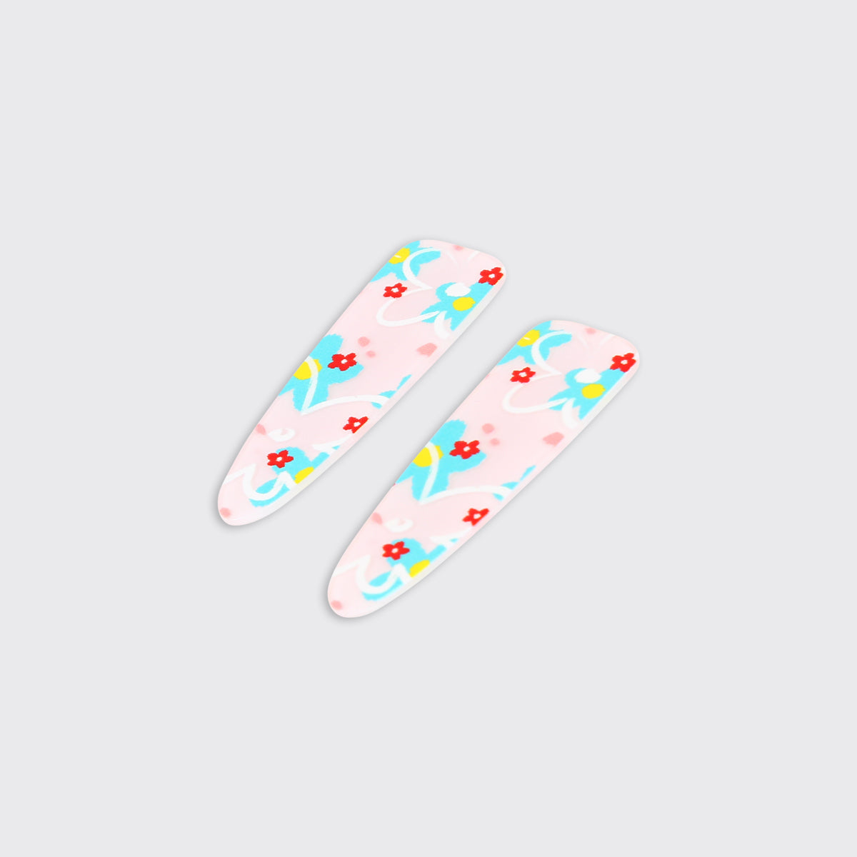 | A pretty pair of clips with blue and red flowers on a pink background. Summer hair in an instant! Our Millie Mae hair accessories hold hair securely, are very comfortable to wear and are highly durable. Approx Size: 6.9 x 2cm Material: Plastic and Metal Care Instructions: Wipe clean |