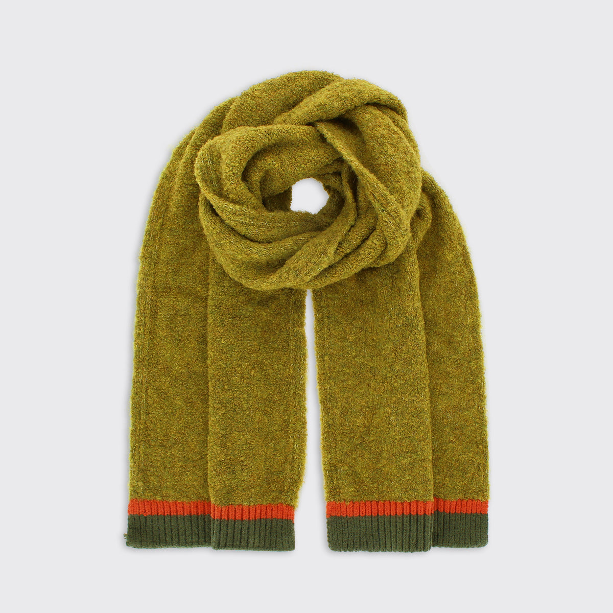 Super soft men's green scarf. Extra long length enables you to loop around the neck a few times or leave to hang long for a choice of looks. This men's scarf is made of luxurious boucle yarn.