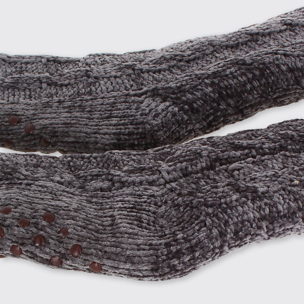 Cosy knitted chenille thick slipper socks with warm fleecy lining. Perfect for toasty toes! Our slipper socks have grippers on the sole, are extra long and are finished with fluffy white tops.