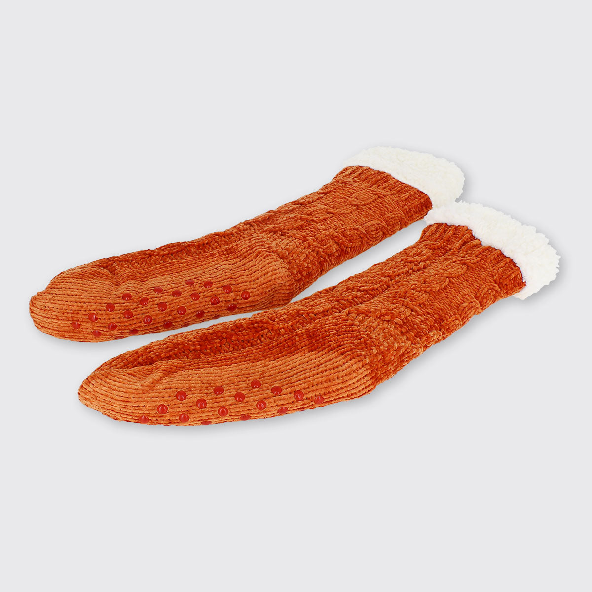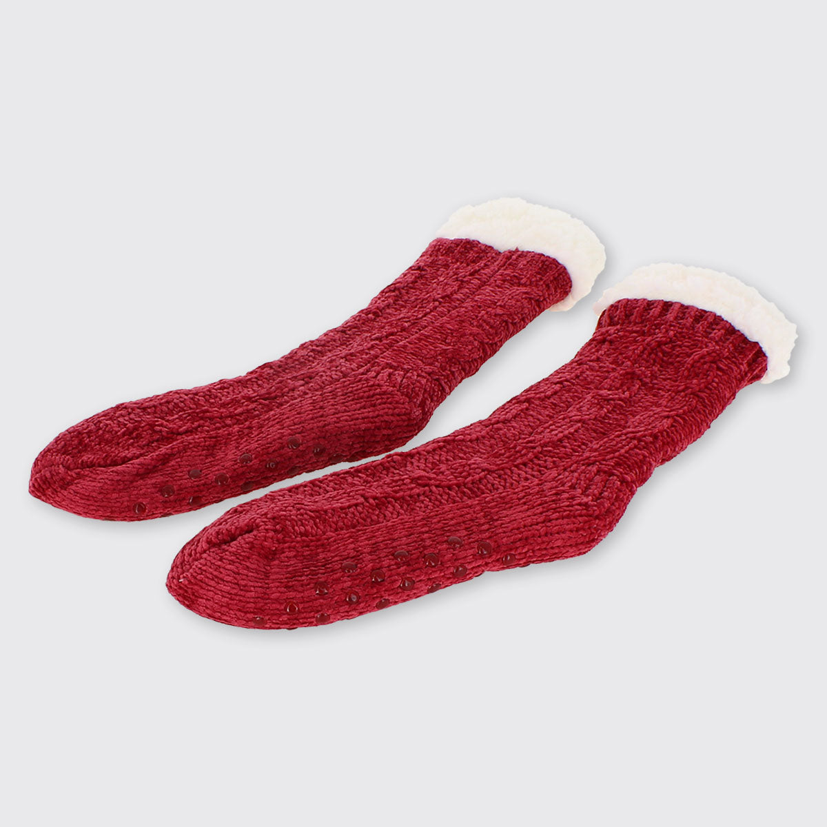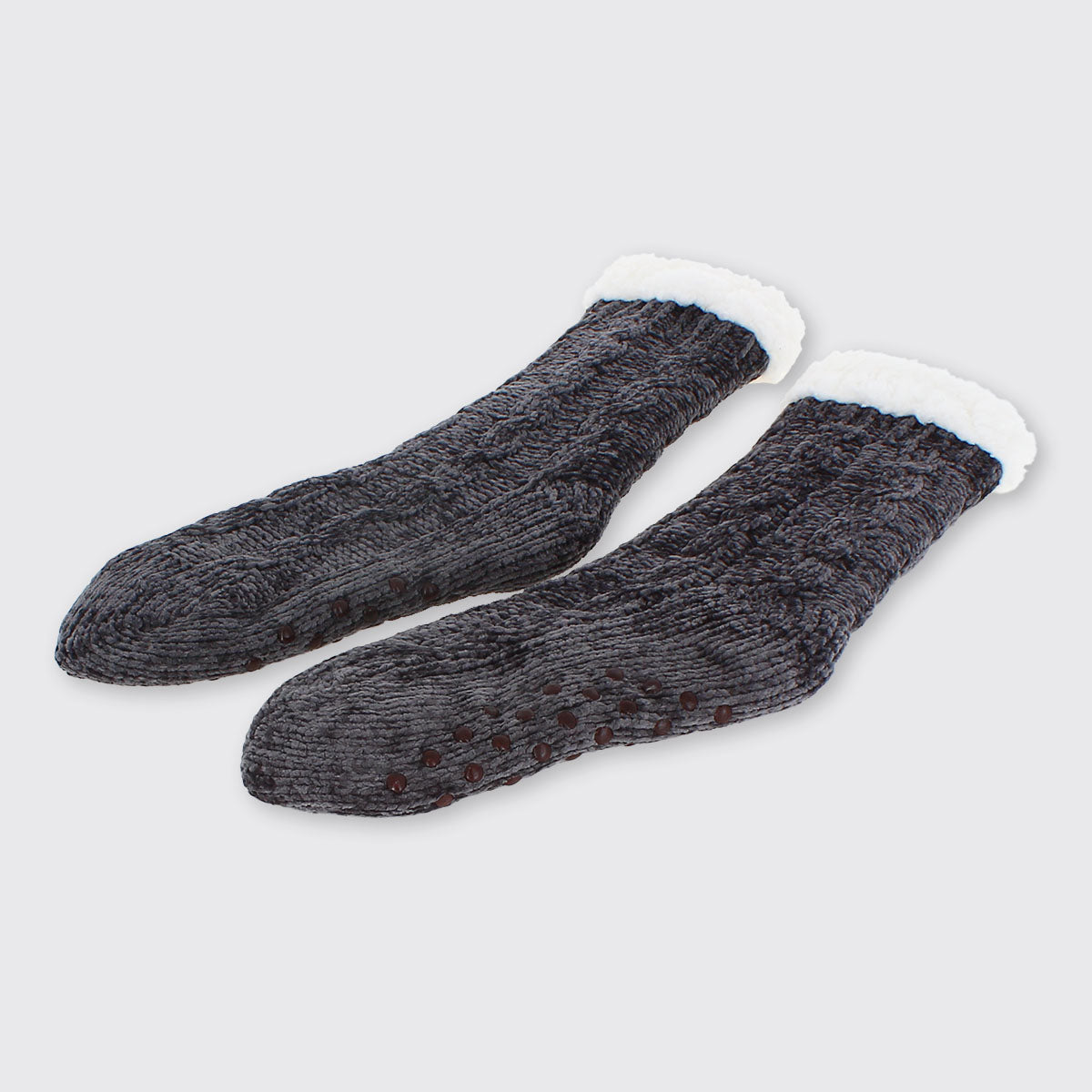 Cosy knitted chenille thick slipper socks with warm fleecy lining. Perfect for toasty toes! Our slipper socks have grippers on the sole, are extra long and are finished with fluffy white tops.