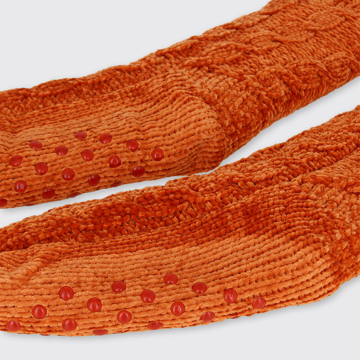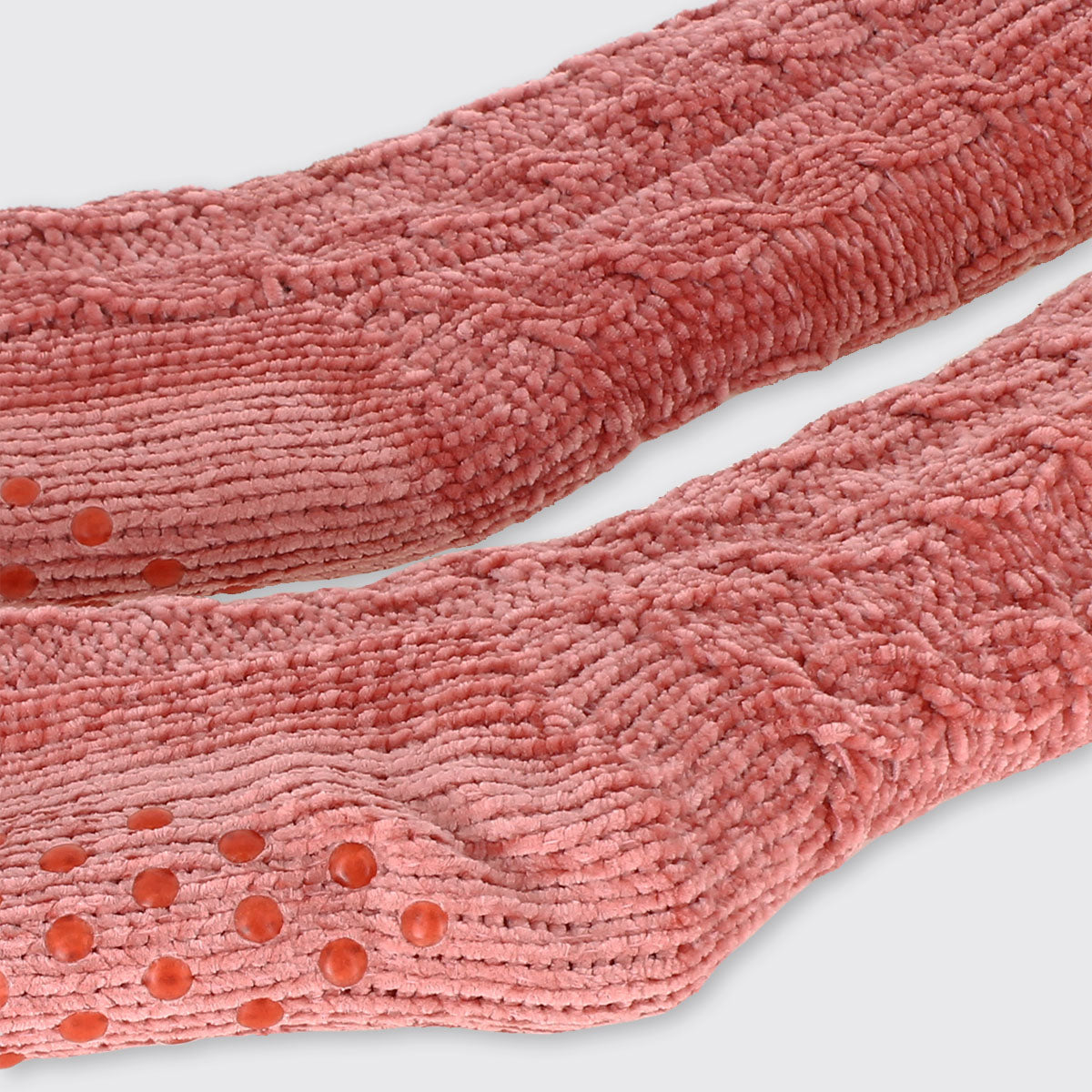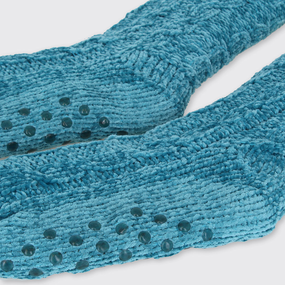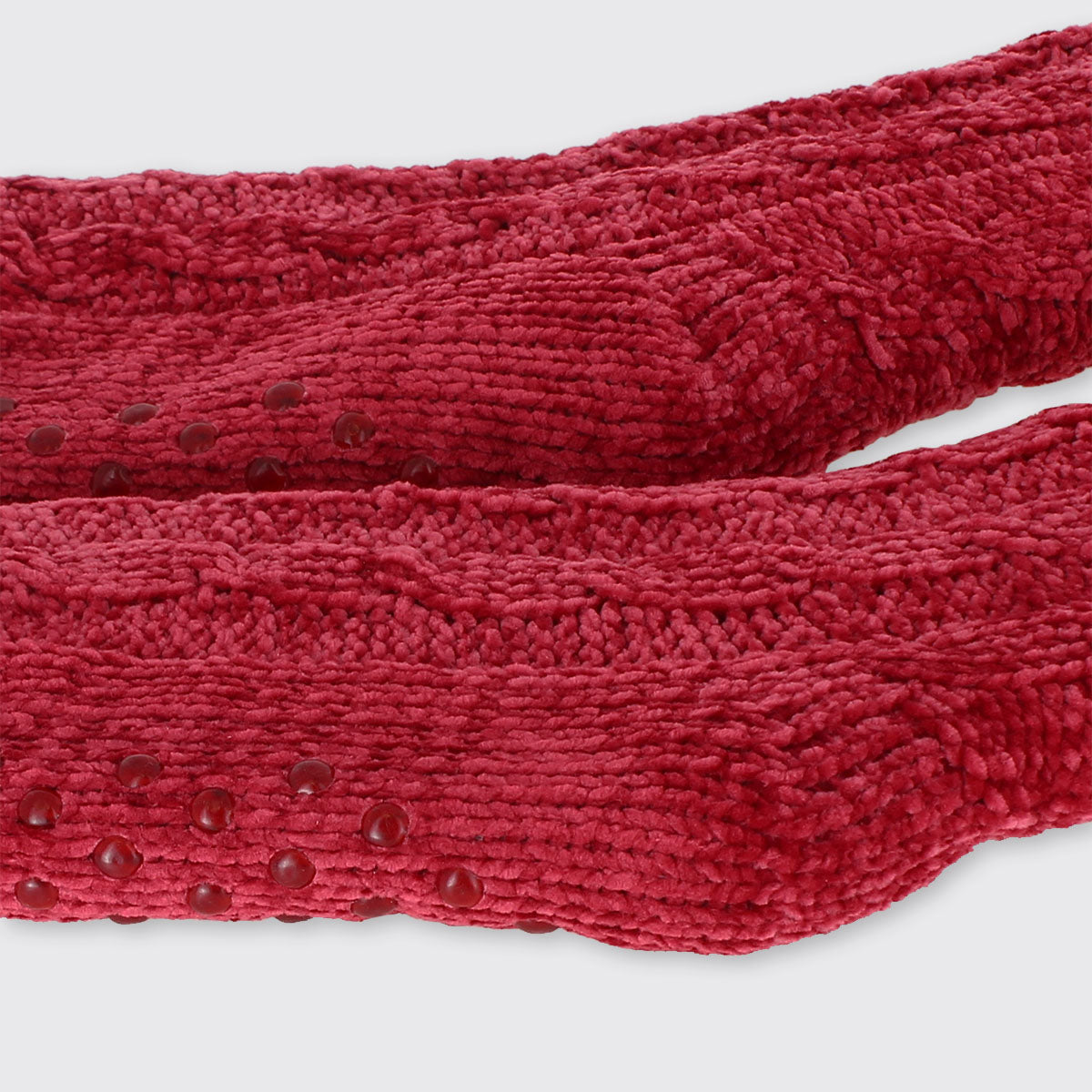 Cosy knitted chenille thick slipper socks with warm fleecy lining. Perfect for toasty toes! Our slipper socks have grippers on the sole, are extra long and are finished with fluffy white tops.