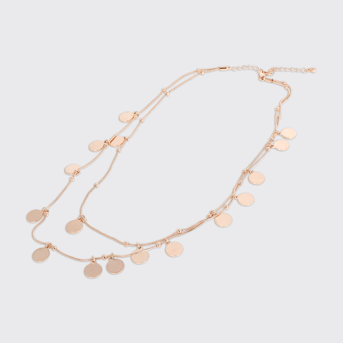 This double layer necklace features delicate chains paired with coin-like discs, it's perfect for daytime or evening wear. |