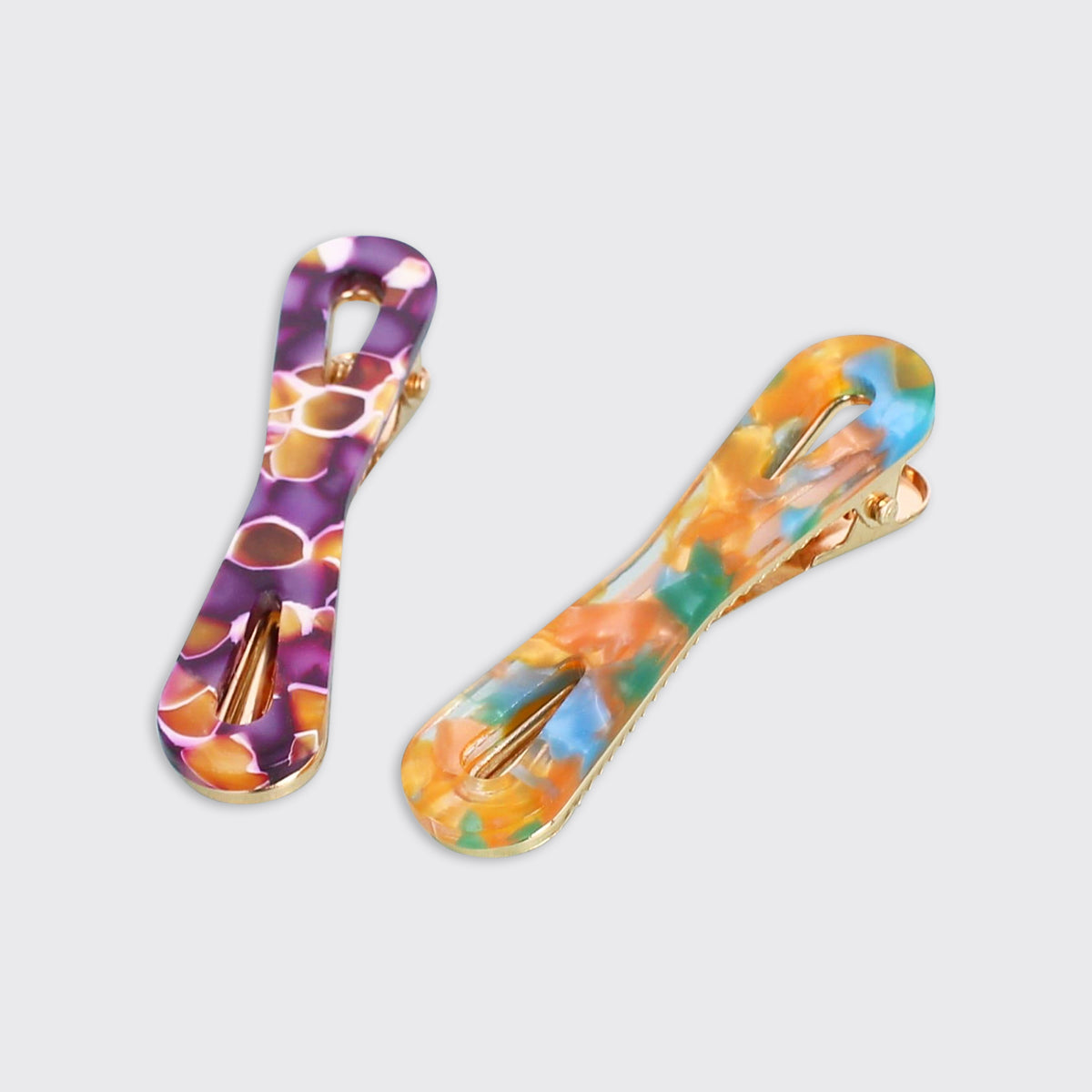 | A set of bow hair clips in two different colours - Rust and Aubergine in a bright, marbled pattern. Perfect for a pop of colour. Our Millie Mae hair accessories hold hair securely, are very comfortable to wear and are highly durable. |