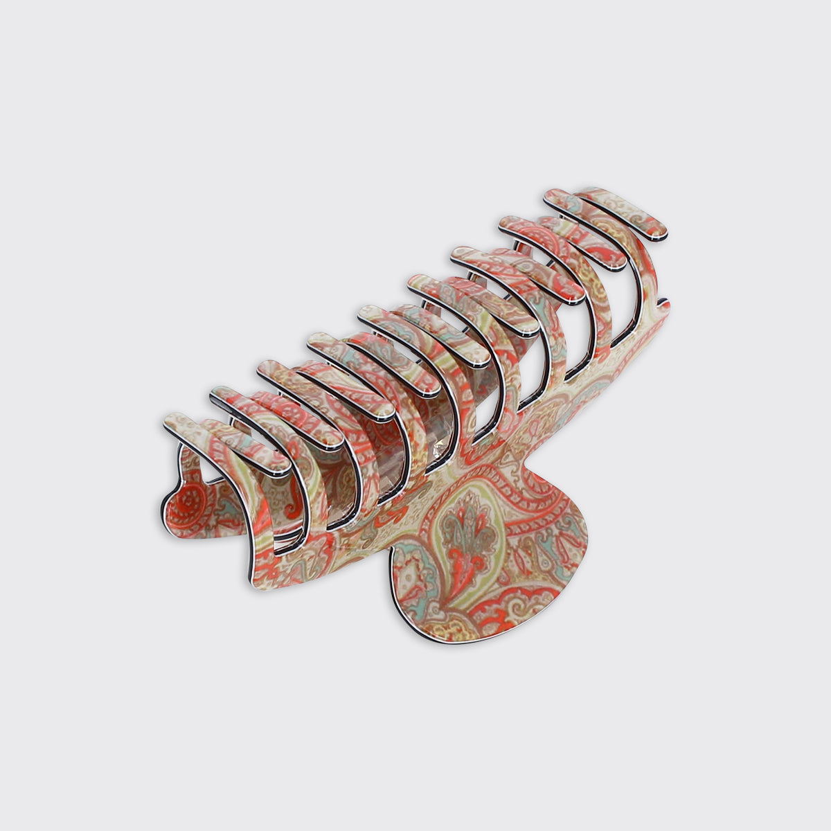 Secure your hair with our Nova Large Claw Clip. This stylish clip features a beautiful orange paisley pattern, perfect for adding a bohemian-inspired touch to your look. It's ideal for creating a half-up hairstyle or a quick and easy up do. For a complete look, be sure to check out our matching small claw clip and the set of two clips, all featuring the same charming design.