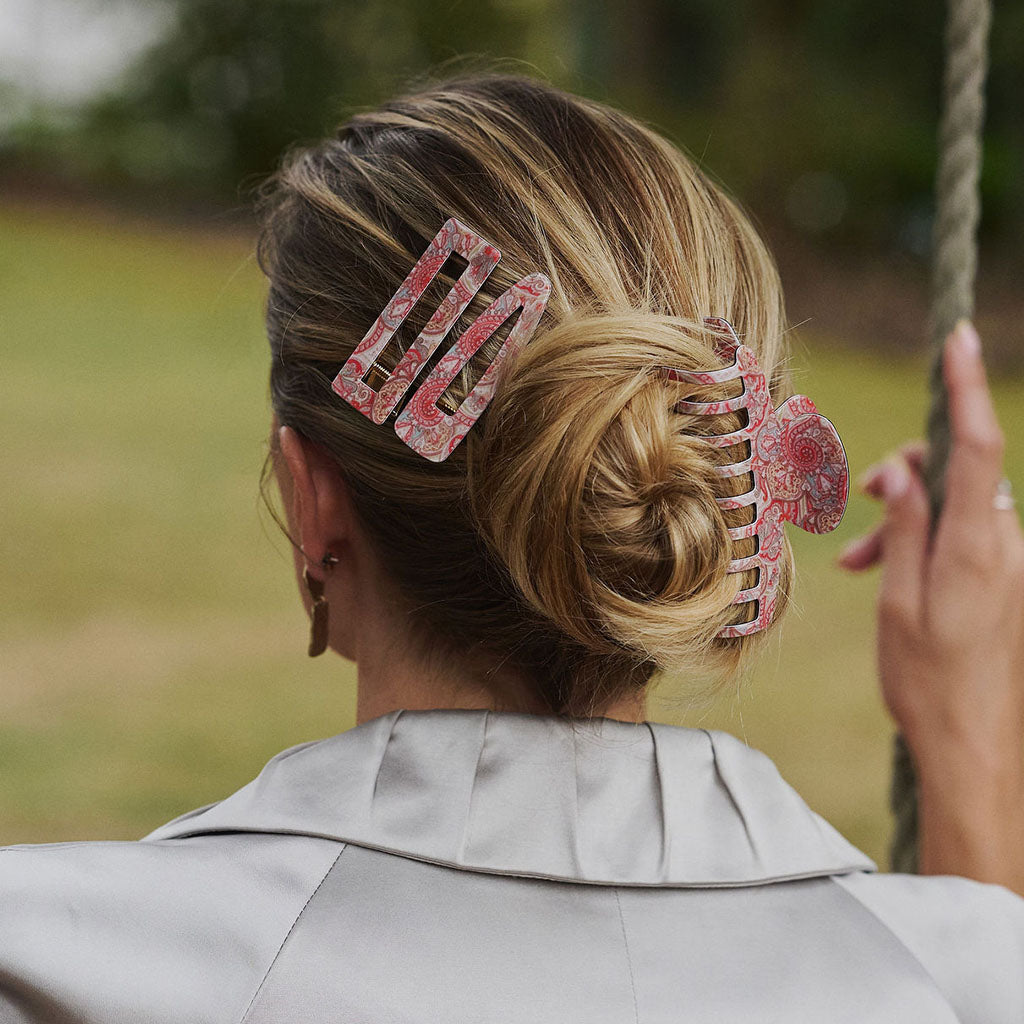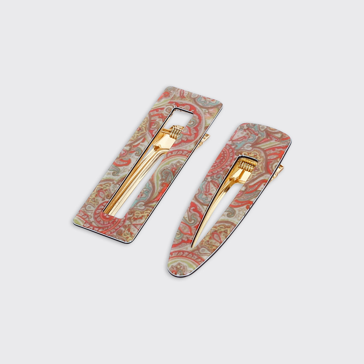 Add a touch of charm to your hairstyle with our beautiful Nova Set of Two Hair Clips. This duo includes one classic rectangular shape and the other with a rounded silhouette, both showcasing an orange paisley pattern, perfect for adding a bohemian-inspired touch to your look. They're perfect for securing bangs, holding back a side part, or adding a stylish accent to any look. Wear them together or pair them with our matching claw clips for a coordinated look.