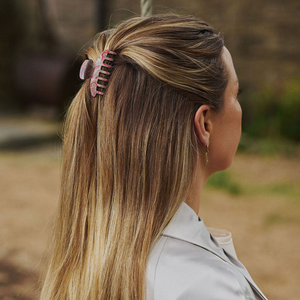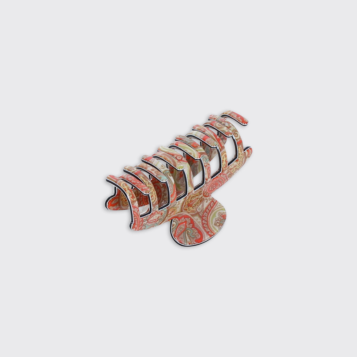 Secure your hair with our Nova Small Claw Clip. This stylish clip features a beautiful orange paisley pattern, perfect for adding a bohemian-inspired touch to your look. It's ideal for creating a half-up hairstyle or a quick and easy up do. For a complete look, be sure to check out our matching large claw clip and the set of two clips, all featuring the same charming design.