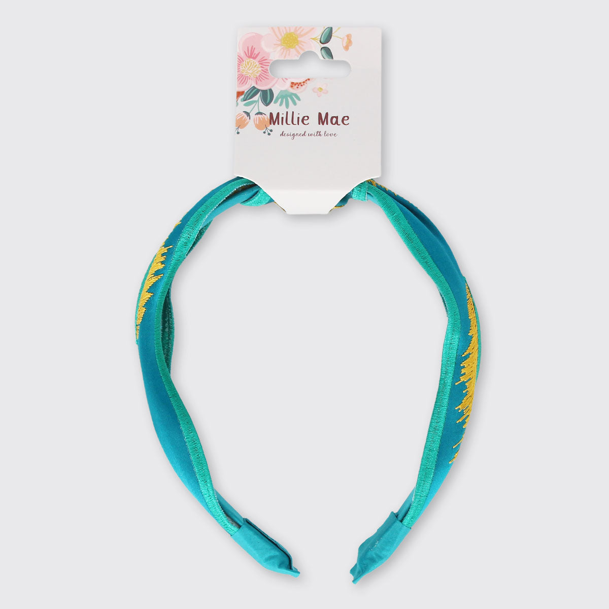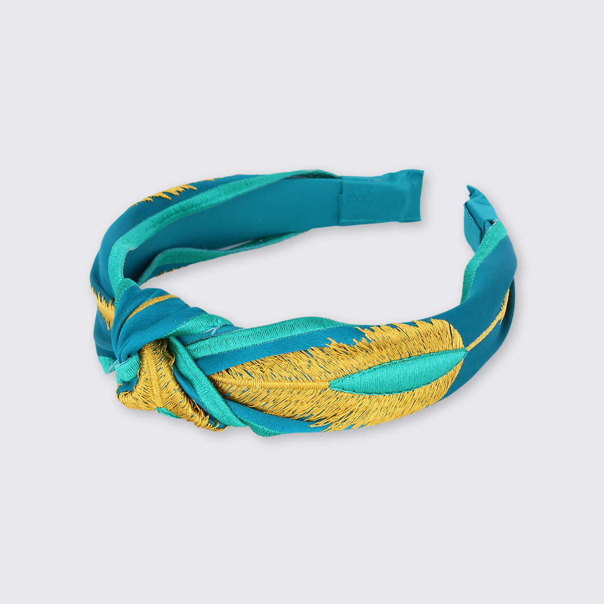 A stunning peacock feather embroidered wide headband in teal, gold and turquoise, finished with a twist knot top.
