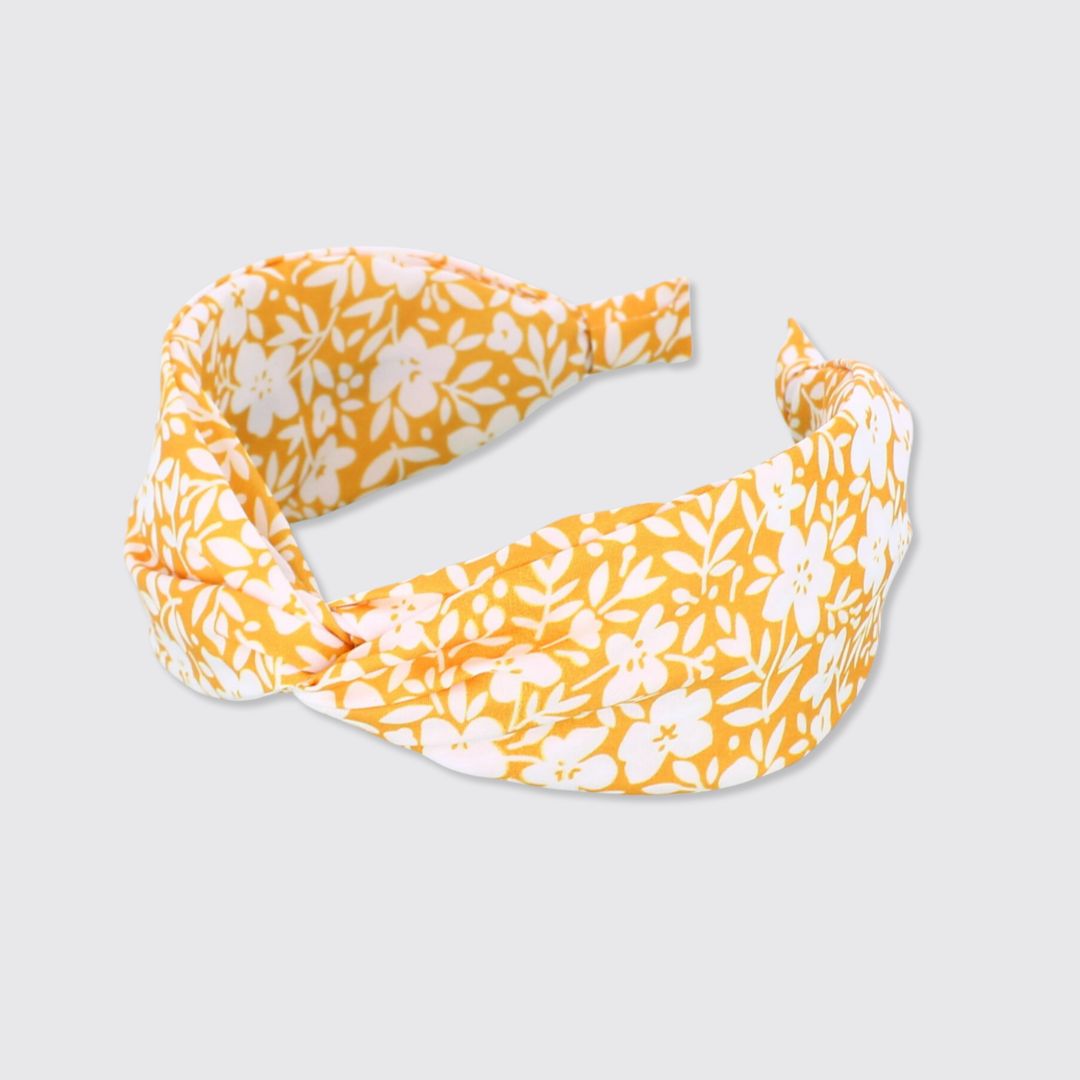 A flower and leaf pattern wide headband finished with a twist knot top. Perfect for a super summery look.