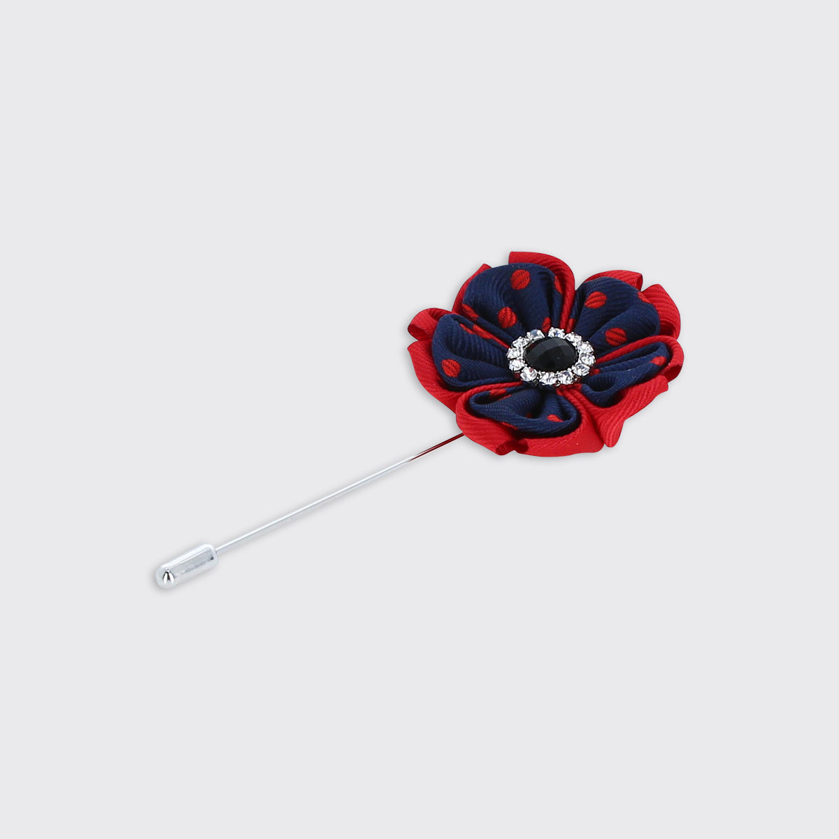 Add a pop of colour to your style with this elegant fabric flower brooch. Featuring layered petals in a navy and red polka dot design, this pin is perfect for jackets, scarves, hats, or bags.