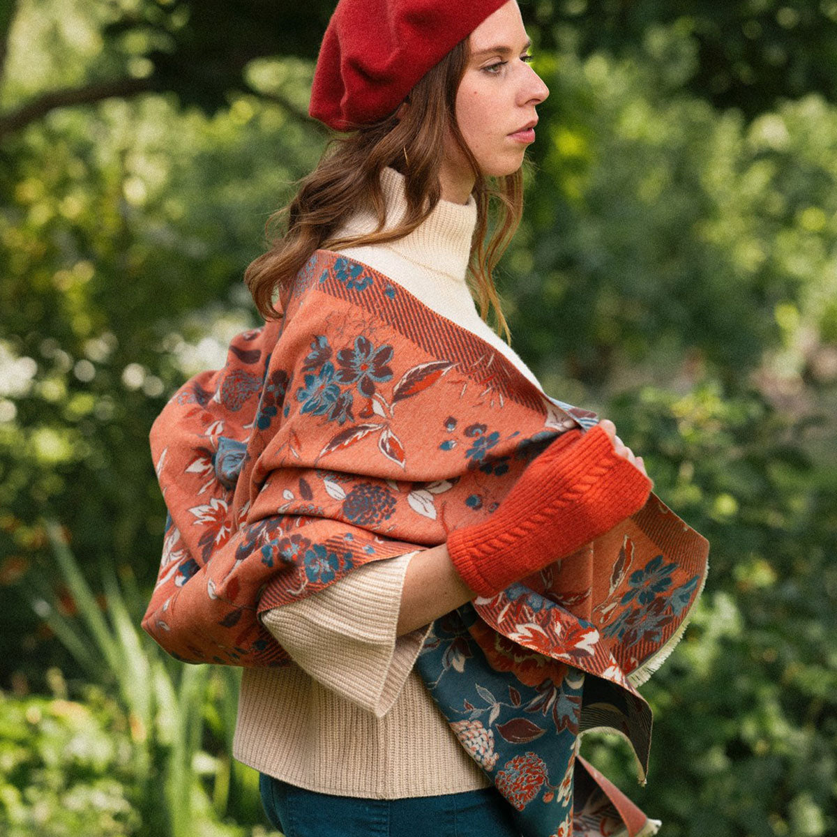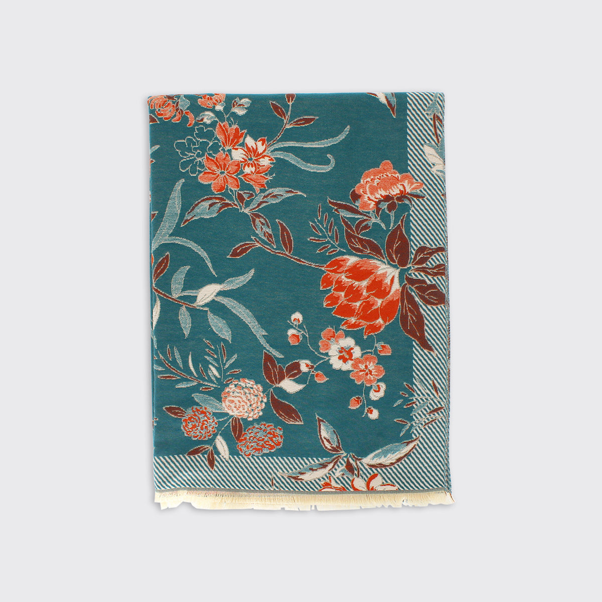 Elevate your wardrobe with this beautiful floral scarf, featuring a teal background adorned with orange and chestnut blooms. Complete with on-trend frayed edges and a versatile double-sided pattern, it offers two unique looks in one!