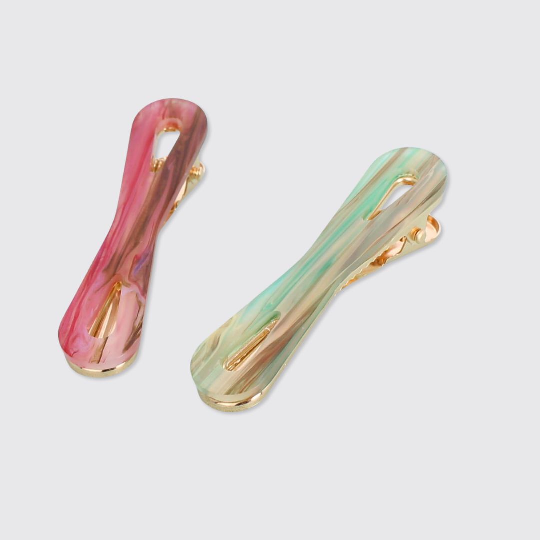 | A set of bow shaped hair clips in two different colours - Green and Aubergine in a bright, marbled pattern. Perfect for a pop of colour. Our Millie Mae hair accessories hold hair securely, are very comfortable to wear and are highly durable. |