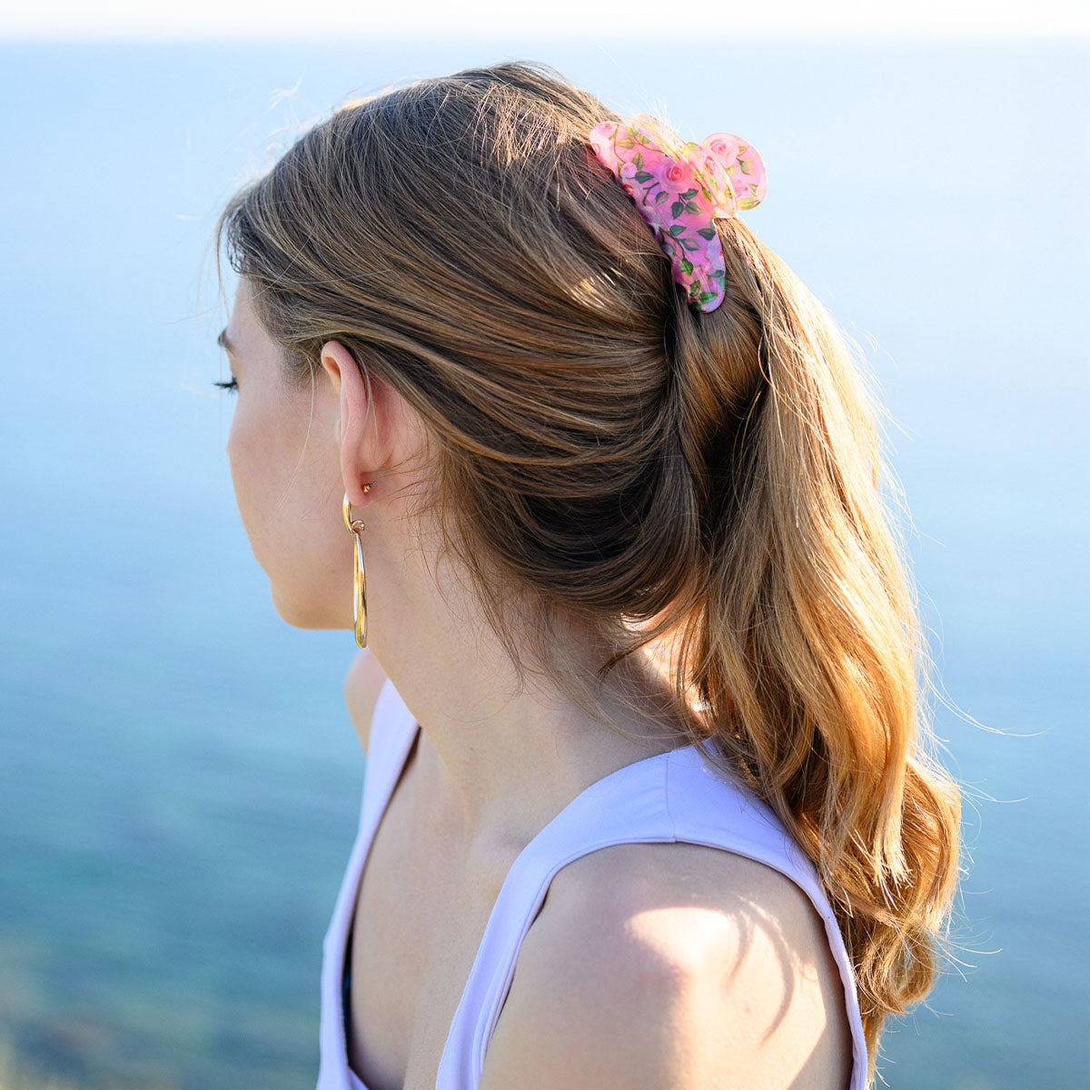 Elevate your everyday hair routine with our Floral Medium Claw Clip. Perfect for securing your hair or creating effortless up dos, this durable claw clip features a dreamy pink rose design that adds a whimsical touch to any outfit.