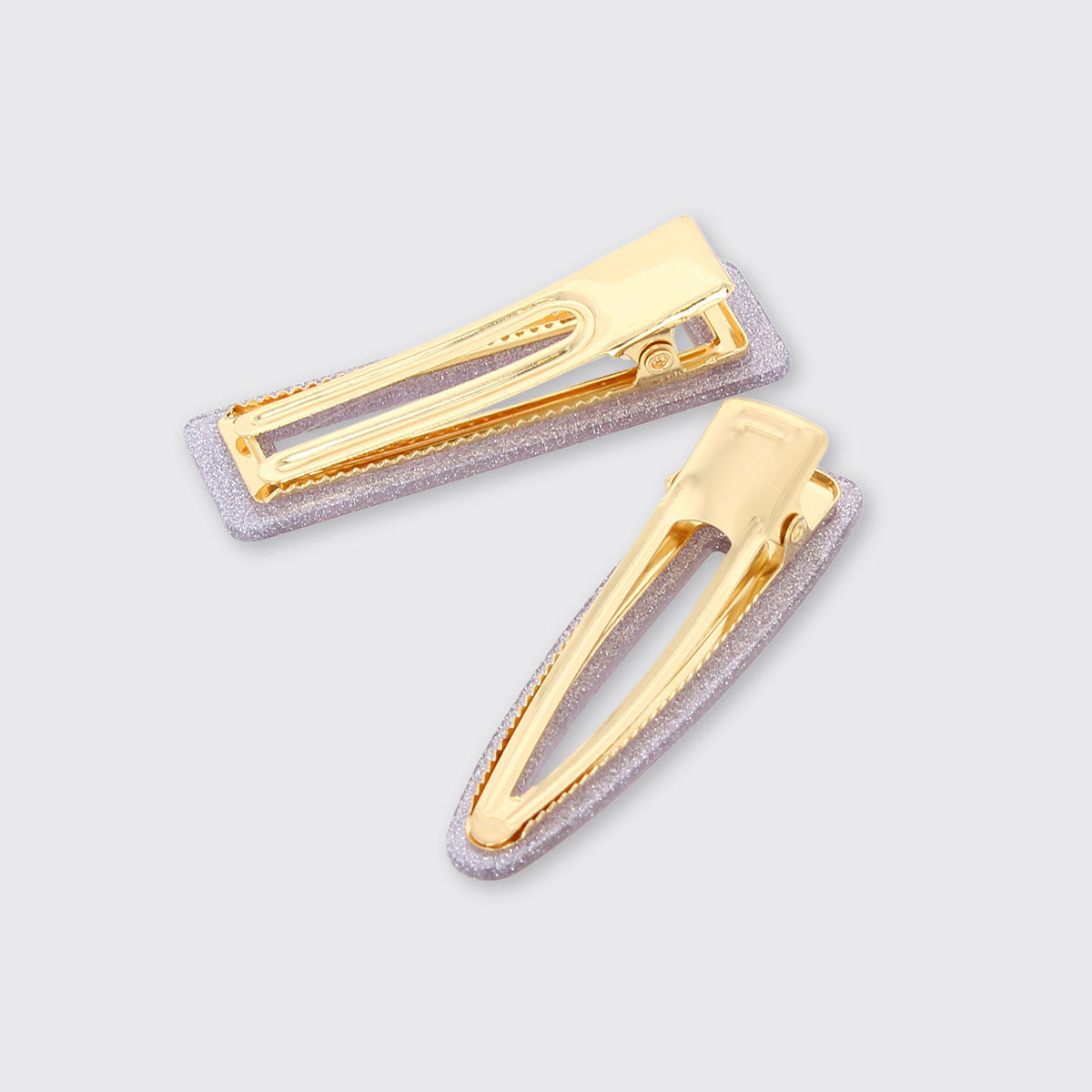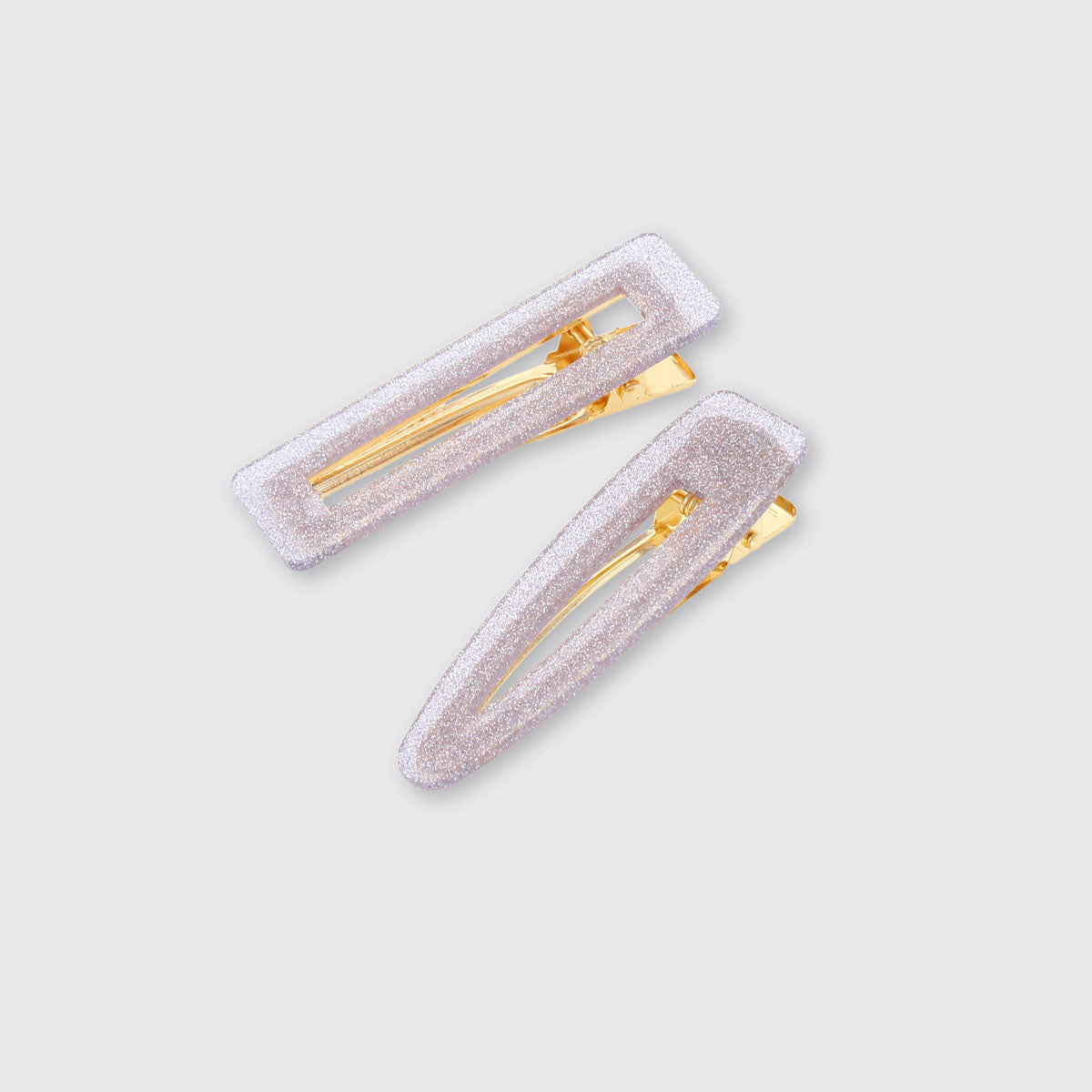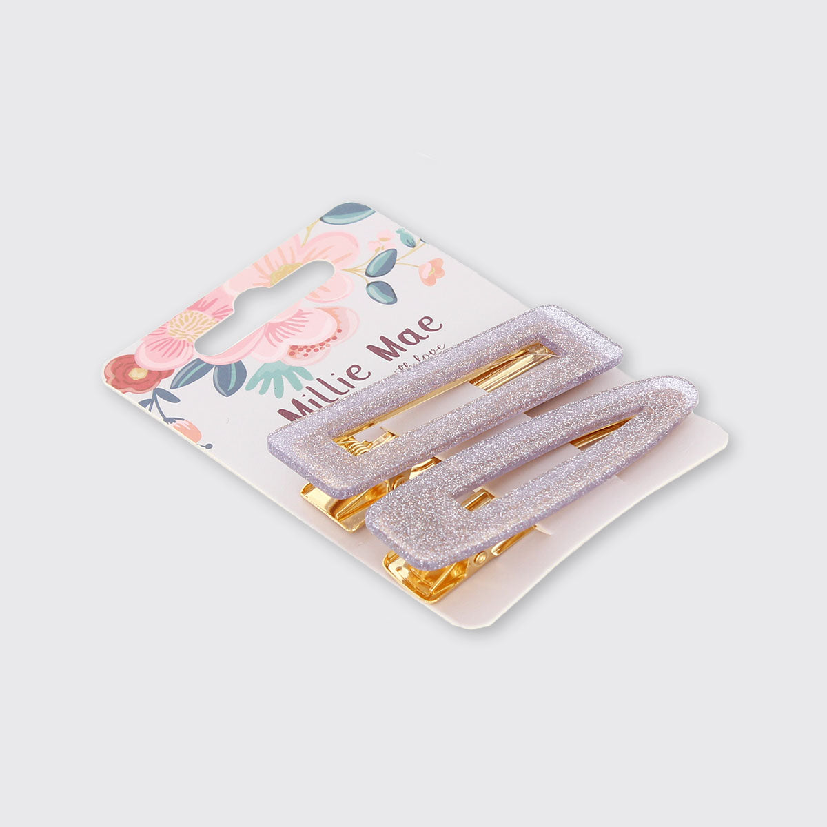 Perfect for parties or to add a little sparkle to your outfit. Our stylish pair of hair clips will keep your hair out of your face and in place. They feature silver glitter, which are complemented by golden hardware. One of each shape to give you a choice of looks. Our Millie Mae hair accessories hold hair securely, are very comfortable to wear and are highly durable. |
