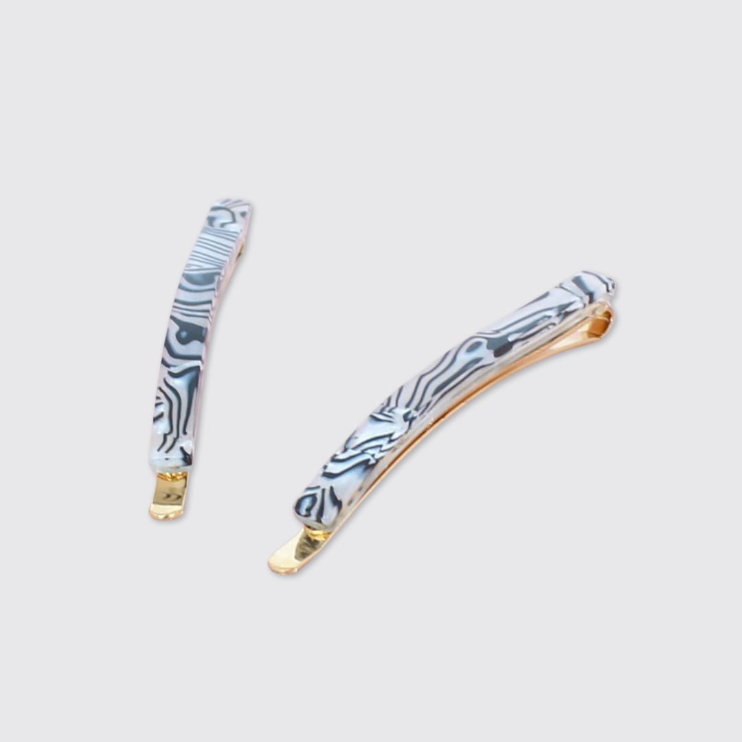 | A pair of thin kirby clips ideal for a subtle style. Ideal for fine hair. The black, grey and white tones go well with any hair colour. Our Millie Mae hair accessories hold hair securely, are very comfortable to wear and are highly durable. |