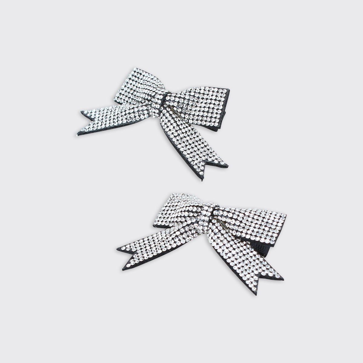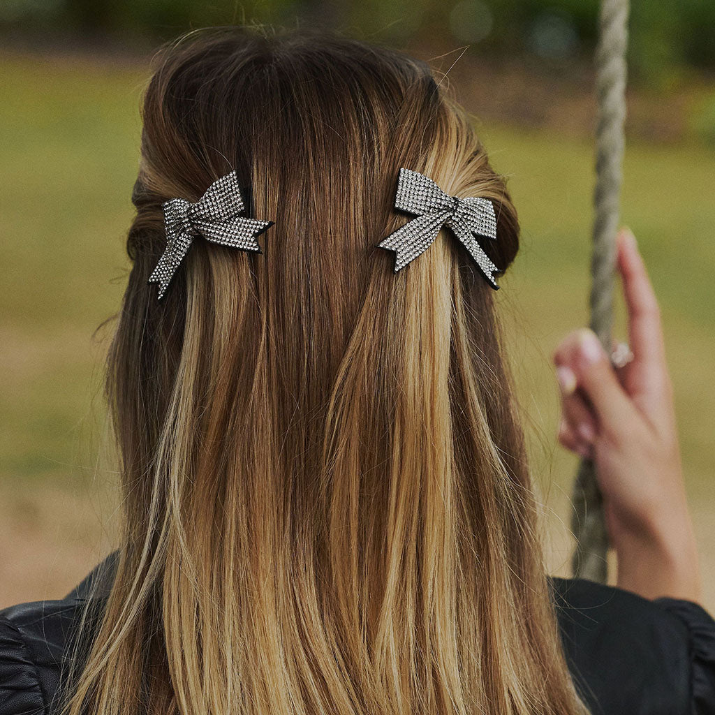 Add instant sparkle with this set of two diamante bow hair clips. Designed in a sleek black base and covered in shimmering gems, they’re the perfect finishing touch for party looks, date nights, or dressing up your everyday. Clip them in to secure loose strands or wear as a statement accessory.