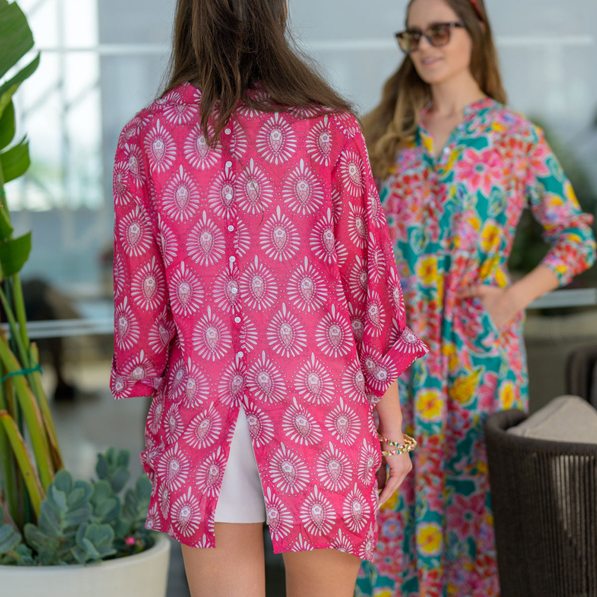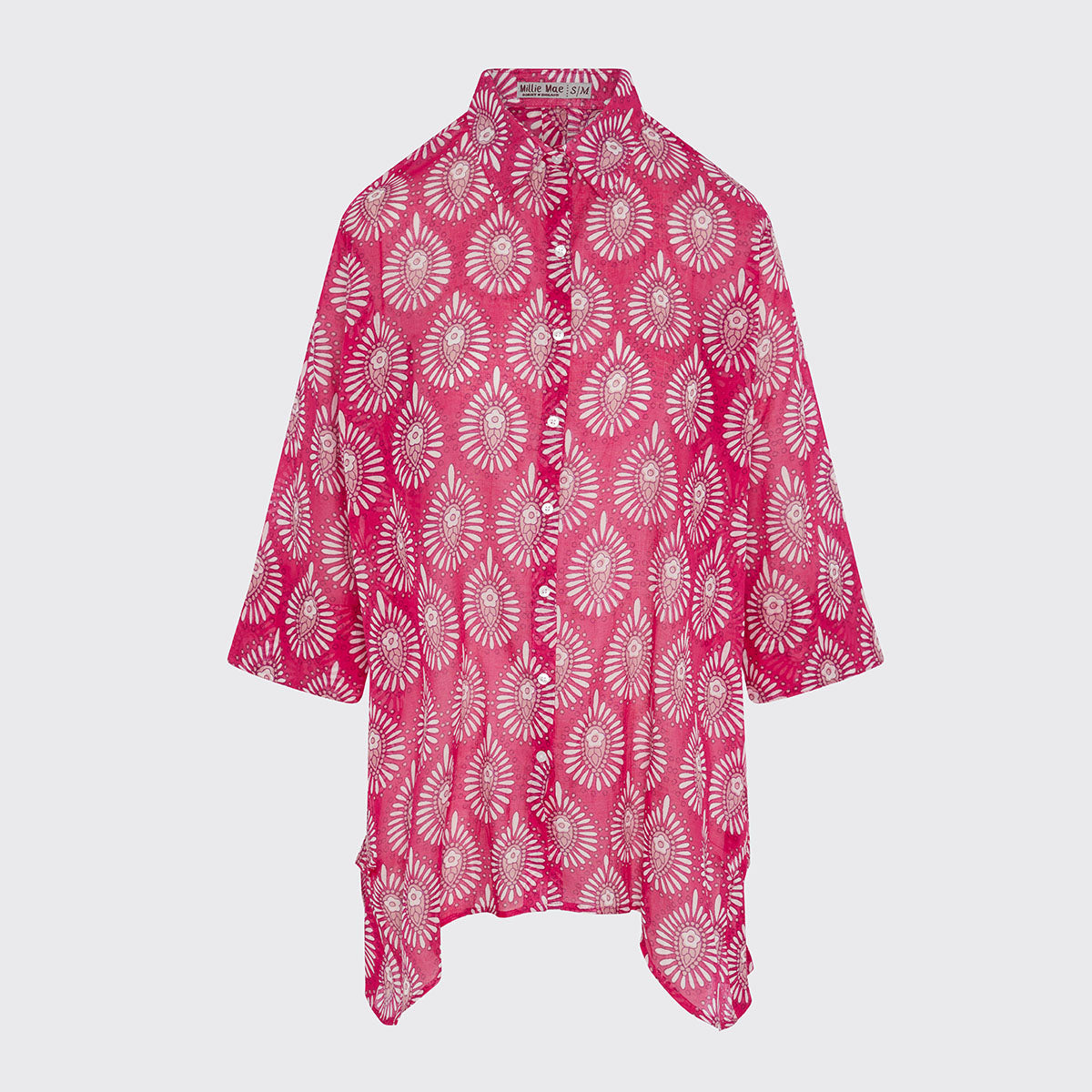 This bold shirt has a dazzling Indian block print pattern in pretty colours. A floaty fit, with elbow length wide sleeves and turned cuffs. The button back makes this an unusual and eye catching women's shirt.