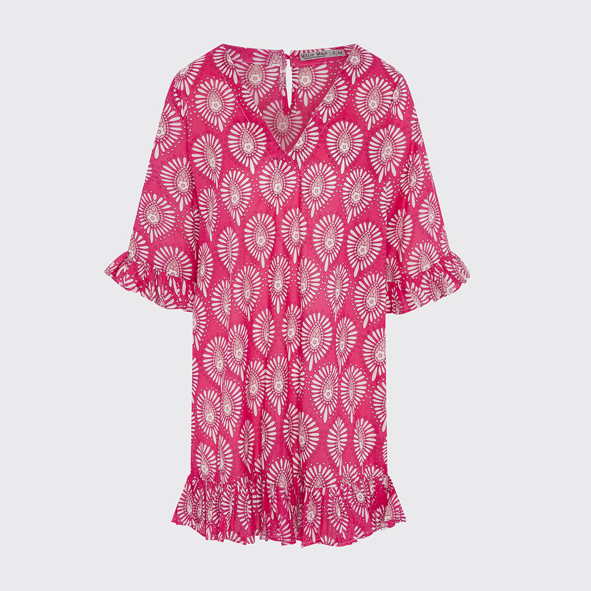 Beautifully designed light weight summer tunic with a flower burst pattern. A floaty fit, with elbow length ruffle sleeves and hem. Wear on it's own or pair with leggings.