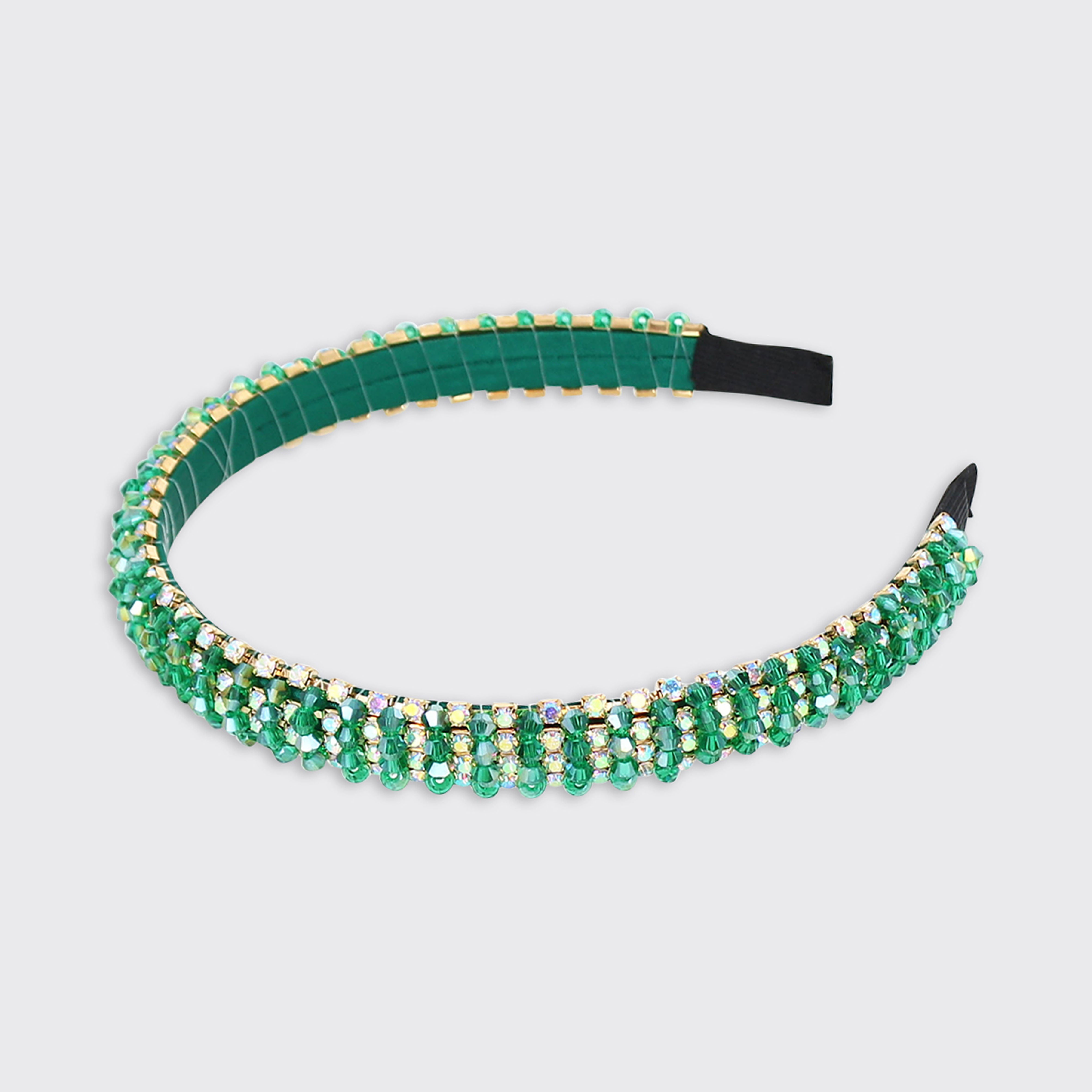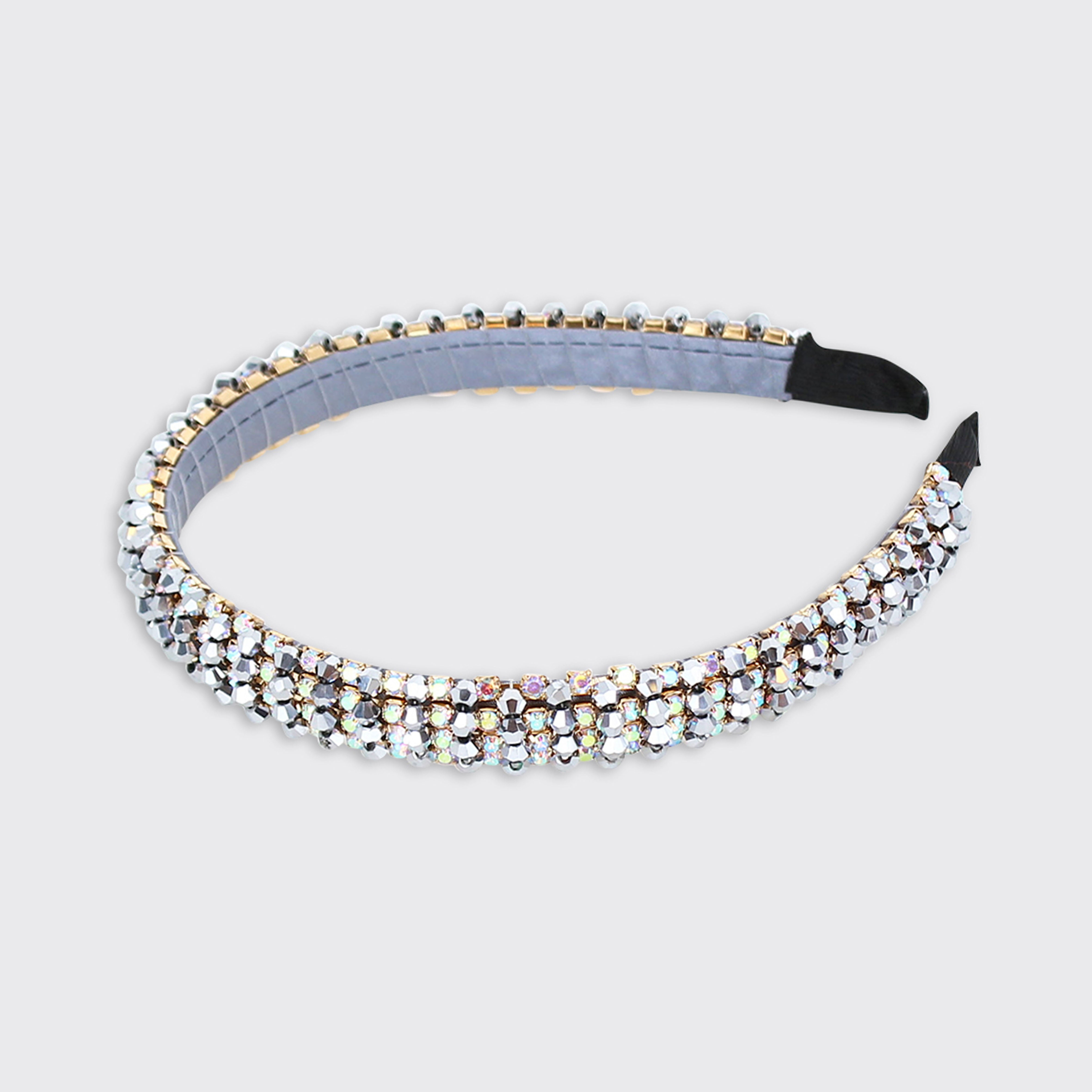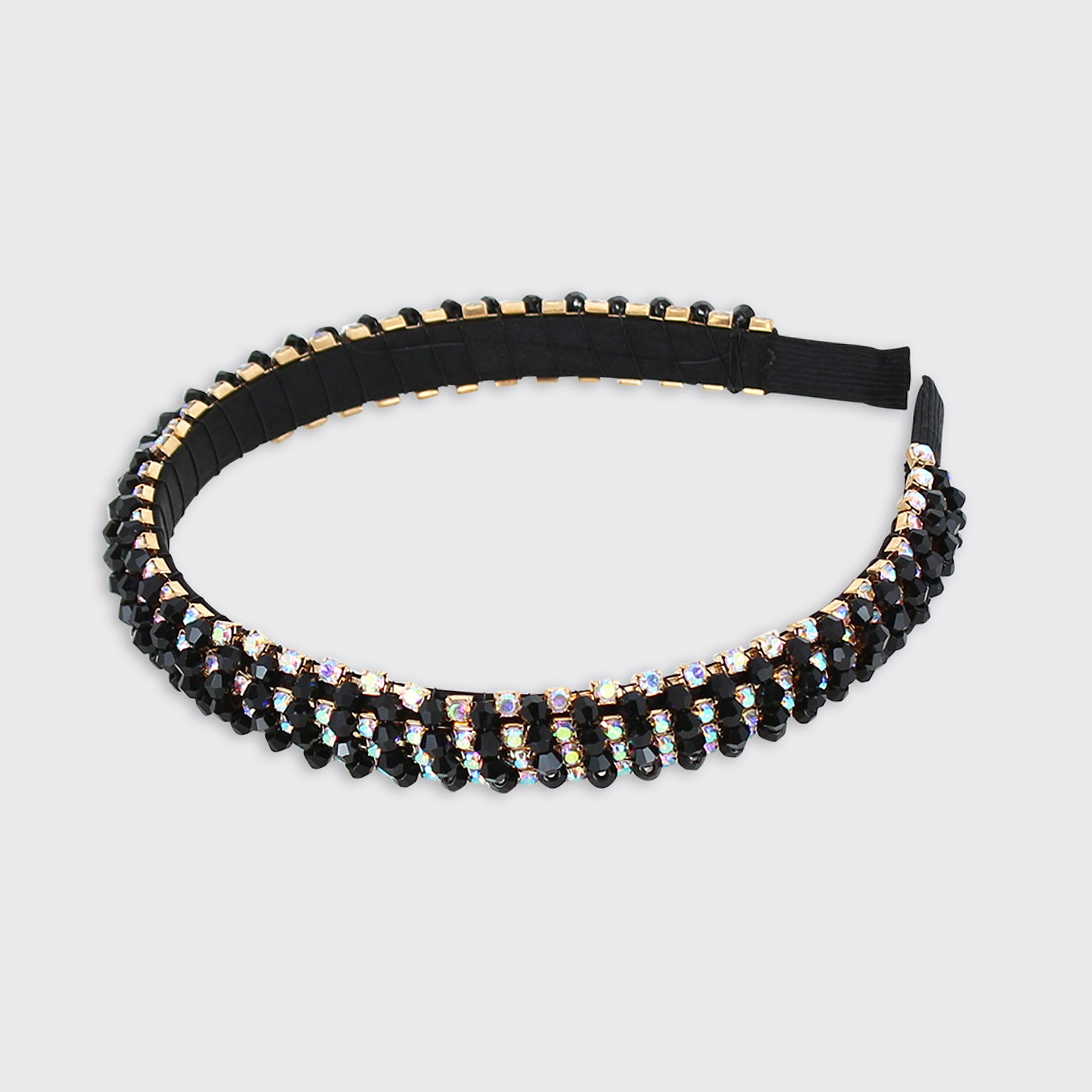 Perfect for parties or to add a little sparkle to your outfit. This headband features sparkling beads and iridescent crystals arranged in rows, giving it a dazzling appearance. It has a comfortable lining and fabric-covered ends for a secure fit.