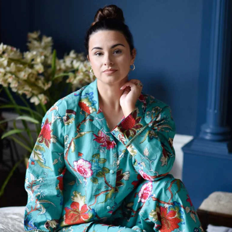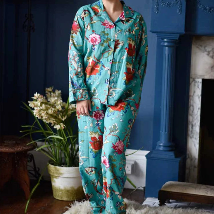 Make a style statement in these vibrant pyjamas! This beautiful print of multi-coloured exotic flowers and foliage against a vivid teal background will make bedtime colourful. The print is complimented by the contrasting sage green pom-pom trim on the jacket cuffs and hems of the trousers. The pyjama jacket fastens with fabric covered buttons and has a single breast pocket, and the trousers have an elasticated drawstring waist for comfort.