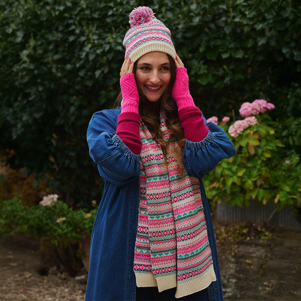 Brighten up grey winter days with this cosy knitted scarf, featuring a fairisle inspired pattern in pink, teal, and cream tones.